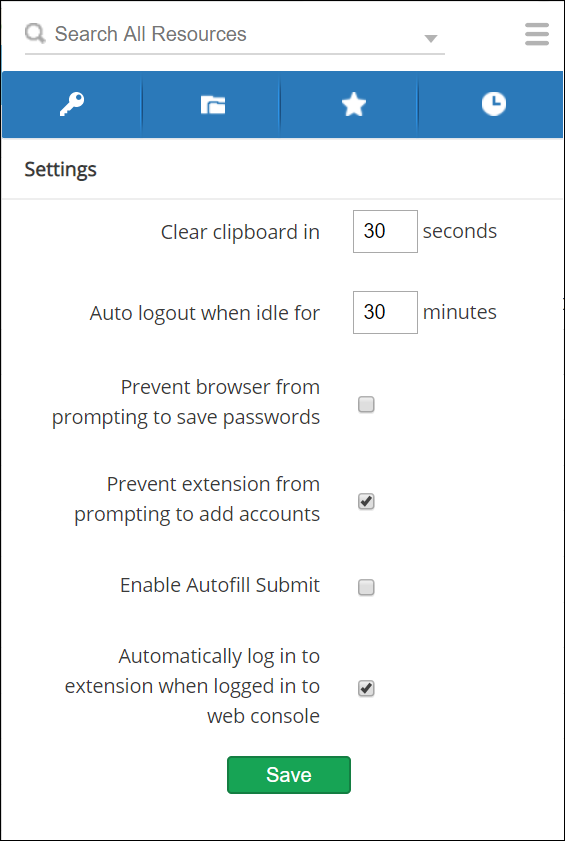 根据资源名称、用户名、 DNS名称、用户帐户、资源类型、资源描述、部门、位置、域名、所有资源或其它自定义字段等多个条件直接从浏览器扩展搜索密码。