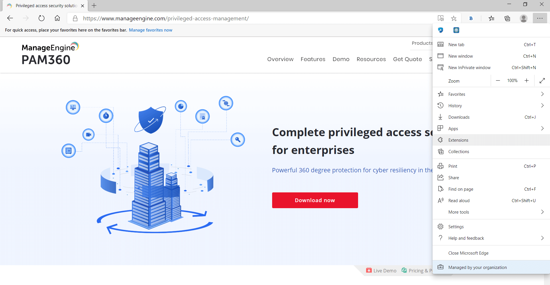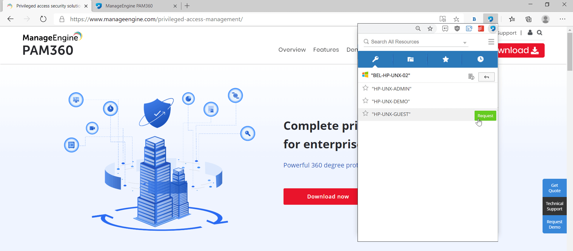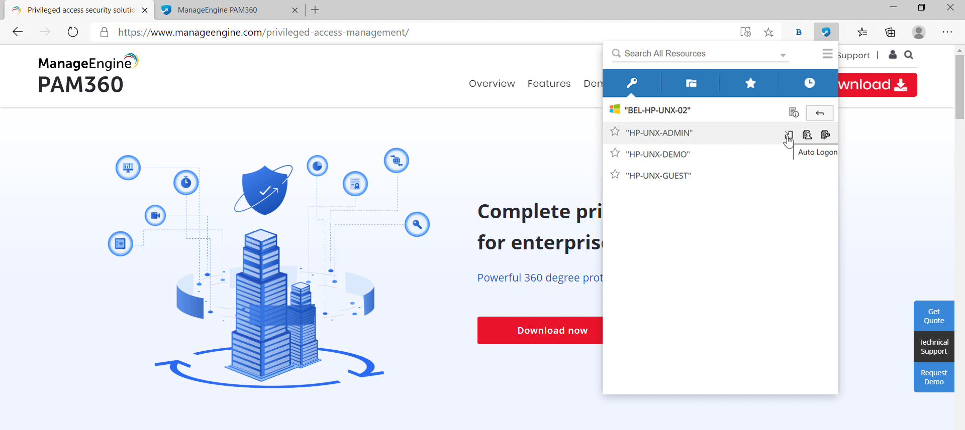 为使密码管理和自动登录活动更加顺滑, PAM360提供通过本机浏览器扩展程序安全地同步密码的选项。该扩展可以帮助您执行特权访问管理操作,如发送和审批密码访问请求、自动填充密码到网站、通过远程网关自动加载 RDP 和 SSH 会话。 此外,该扩展允许您查看所有密码、资源组、收藏的资源、最近使用的资源和搜索选项。