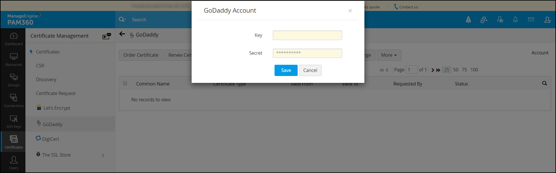 步骤 1:在 PAM360 中配置 GoDaddy API 凭据