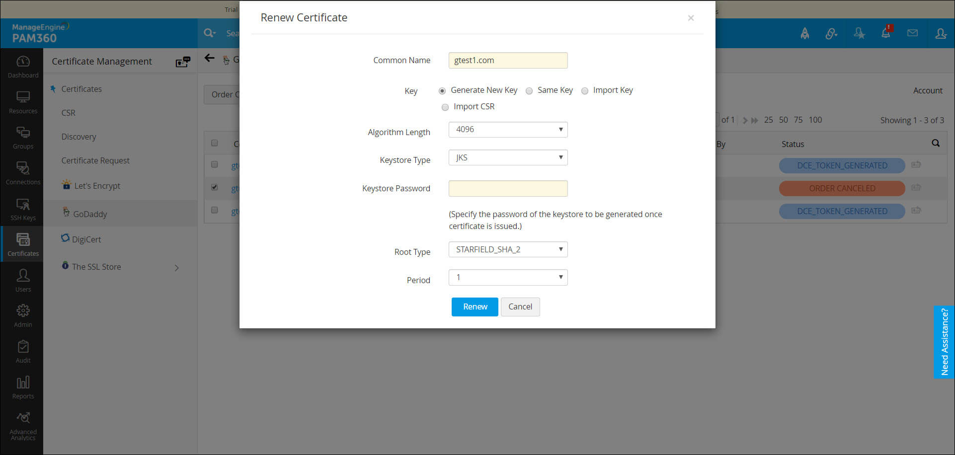 注意:从 PAM360 发出证书请求时,您只能提出与从 GoDaddy 购买的证书设置数量一样的请求。
