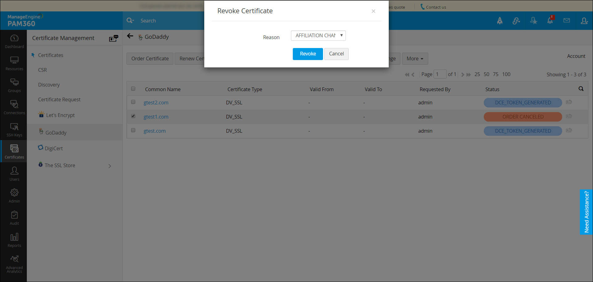 - 验证成功后,GoDaddy将颁发证书并将其自动添加到PAM360的证书库中。