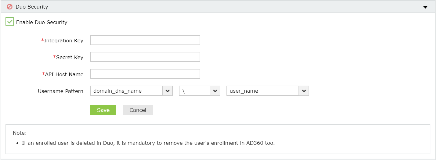 Duo Security是两步验证服务,可在访问应用程序时提供额外的安全性。 用户可以使用Duo移动应用生成的六位数安全代码进行推送通知来登录AD360。