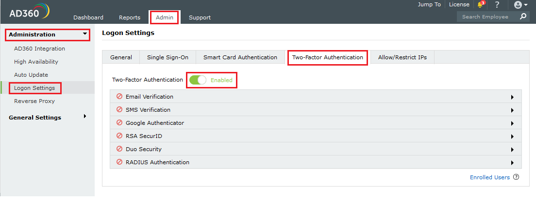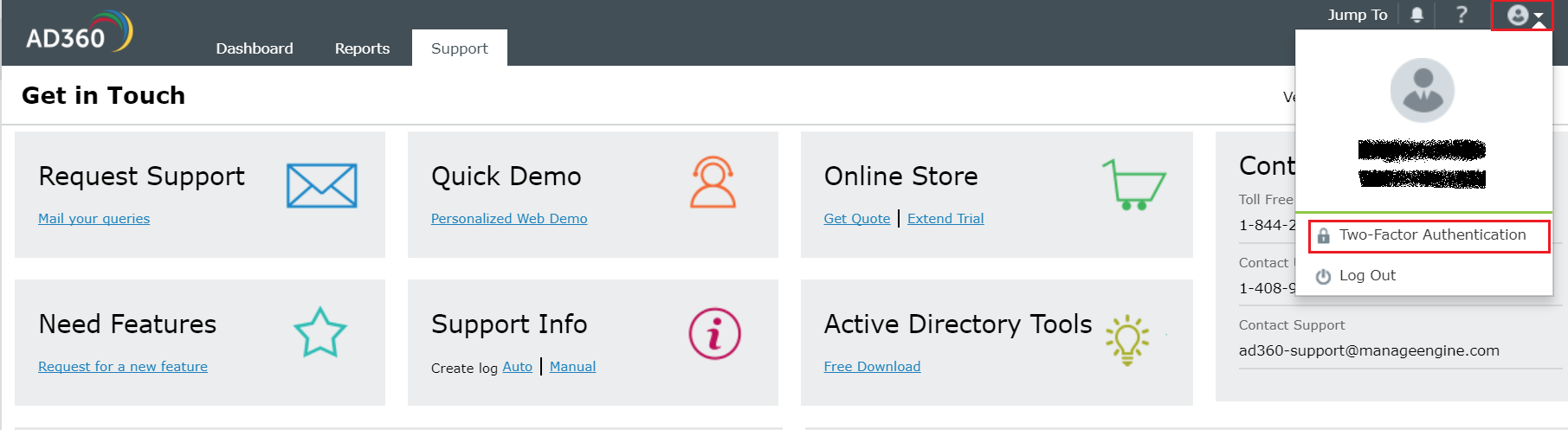 为了增强用户登录的安全性,AD360支持双因素身份验证。启用后,AD360将要求用户在每次登录时除Active Directory凭据外还使用以下一种身份验证机制进行身份验证。