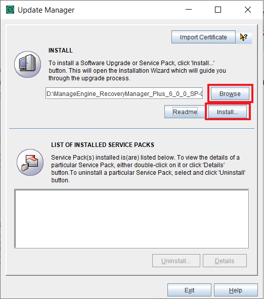 - 7Click Install. Depending on the amount of data to be migrated, the installation procedure might take a few minutes. Please do not terminate the process prematurely. During this step, the certificate that verifies the service pack's integrity is automatically imported by the Update Manager tool.