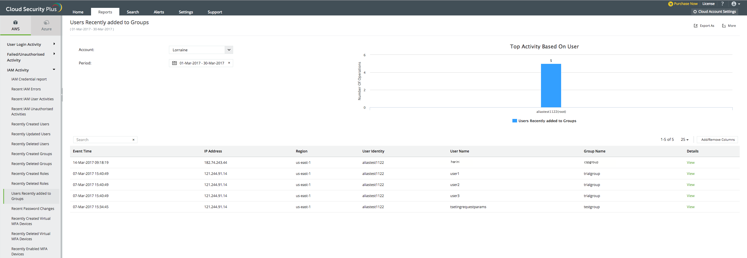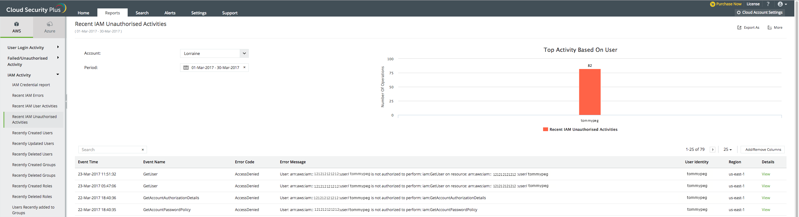 Cloud Security Plus的报表提供了IAM活动的概述,确保不会忽视任何IAM活动。这些报表涵盖涉及IAM用户,组,角色,MFA设备和访问密钥的操作。