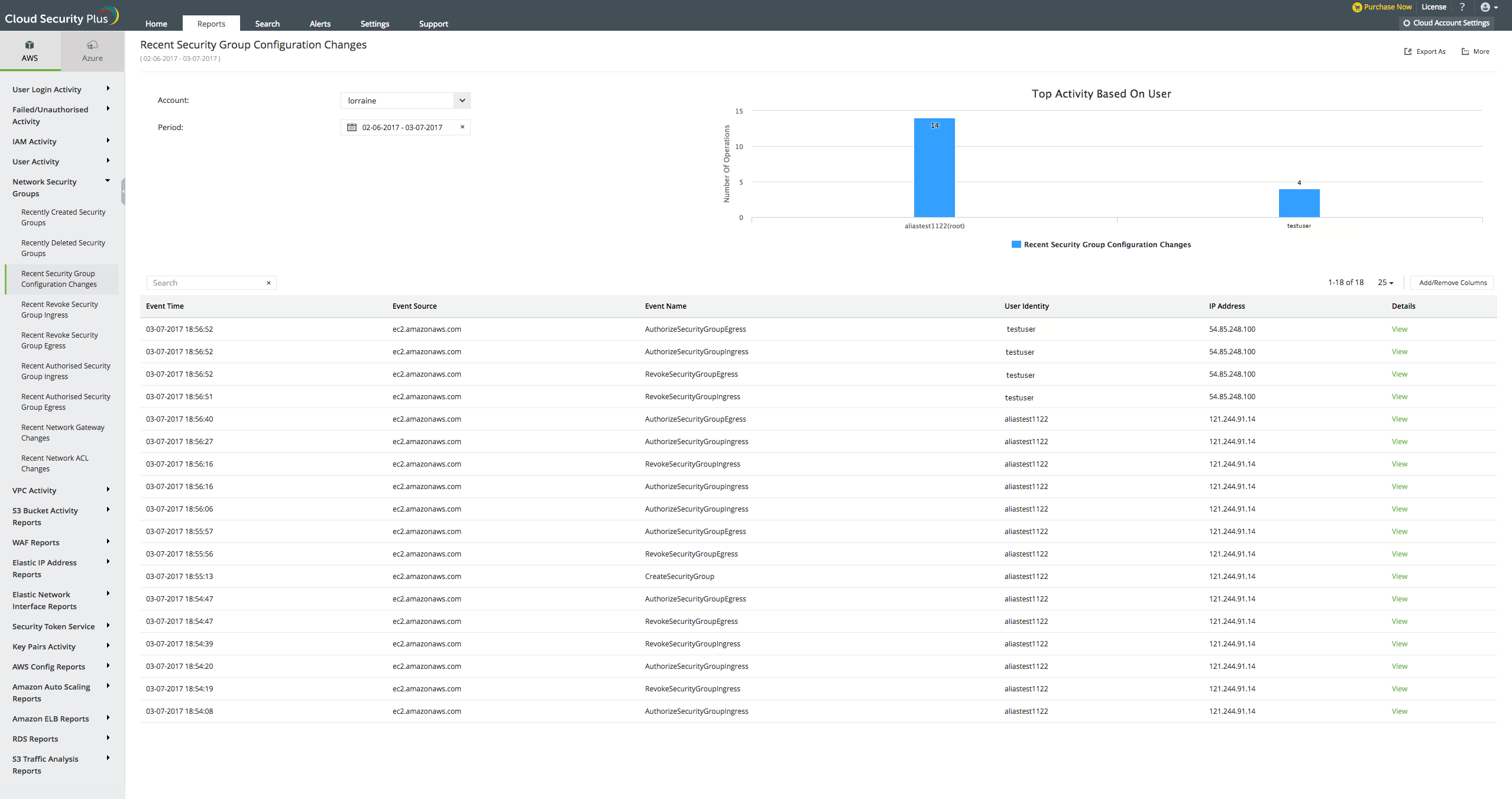 意外地向安全组添加恶意IP地址可能会导致安全惨败。如此重要的是,跟踪每个安全组的变化至关重要。Cloud Security Plus提供有关安全组更改的报表,使安全管理员能够快速检测异常并减轻威胁。