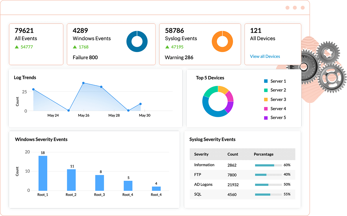 Aggregate logs from critical devices and securely store them on our cloud platform. Log360 Cloud facilitates high-speed search using SQL-based queries and lets you save searches.