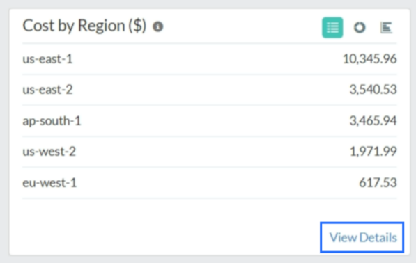 From the Spend Analysis tab, navigate to the Cost by Region ($) section and click View Details. This provides you with a detailed region-wise view of the cloud bills for your cloud infrastructure.