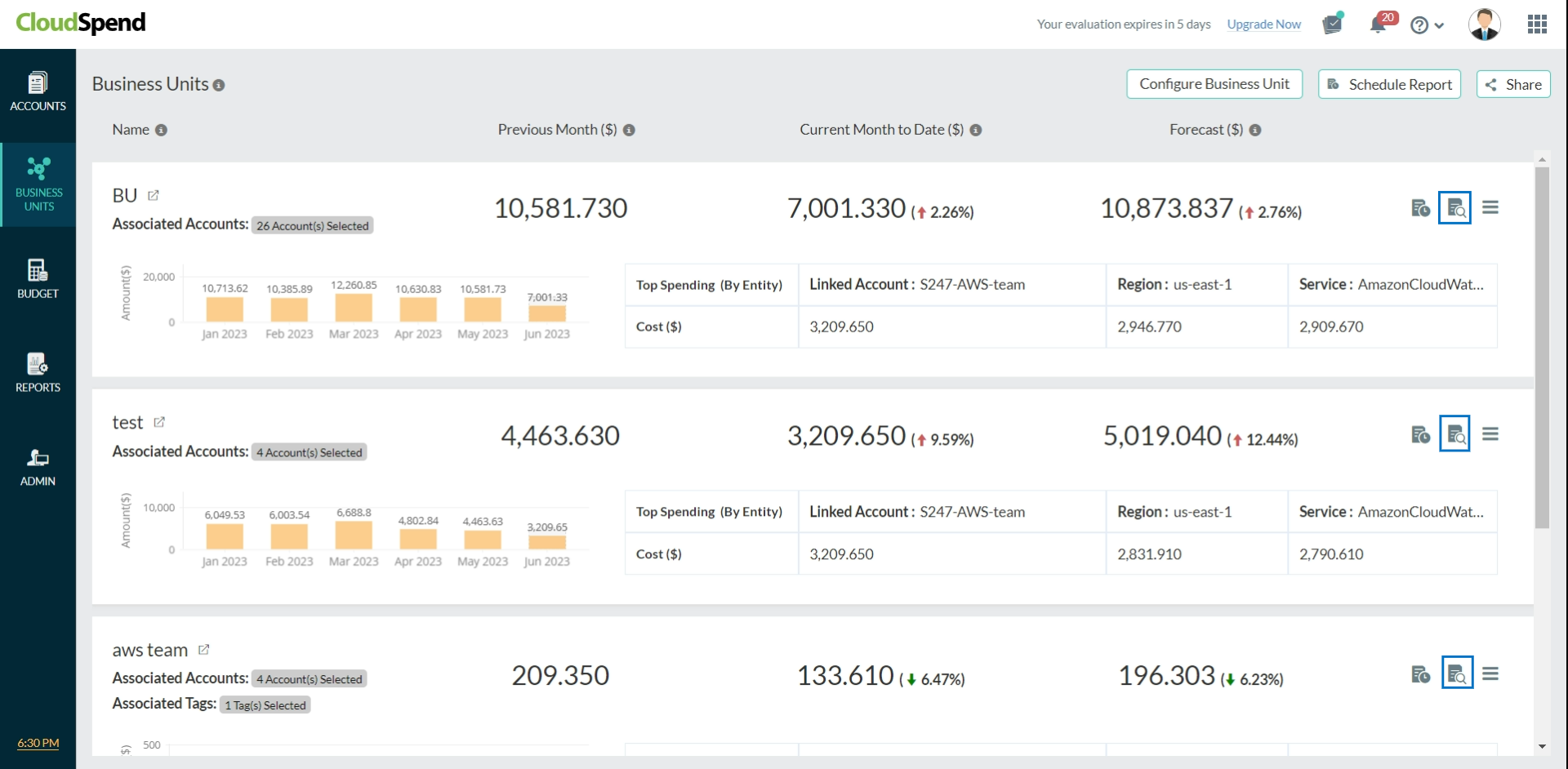 - Timeline: You can view the cloud spending for today, the previous day, the last seven days, the last 30 days, or a custom date range.
