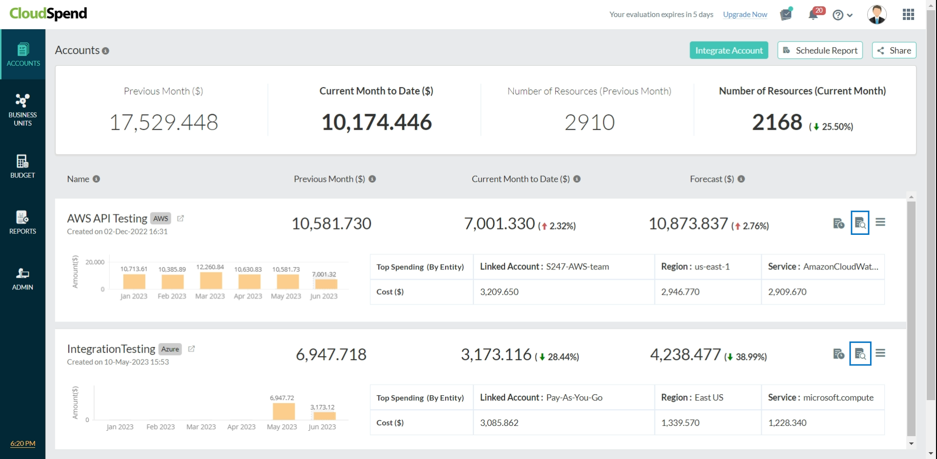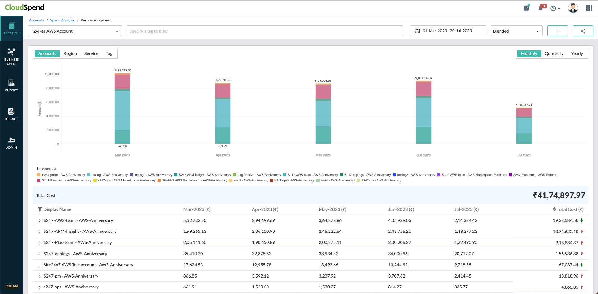 The Accounts Splitup ($) view shows the cloud costs based on the various billing accounts added to your CloudSpend account. From the Spend Analysis tab, navigate to the Accounts Splitup ($) section and click View Details to access Resource Explorer.