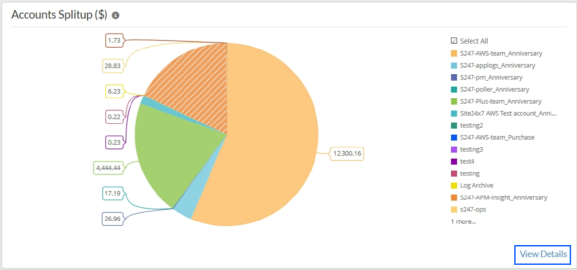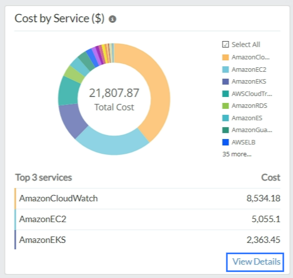 The Cost by Service ($) view displays the top three services that have accrued the highest cloud charges. Hover over each service displayed on the pie chart to view the service-wise split-up of costs. From the Spend Analysis tab, navigate to the Cost by Service ($) section and click View Details. This provides you with a holistic view of all the services in your cloud infrastructure and the corresponding bills for each month.