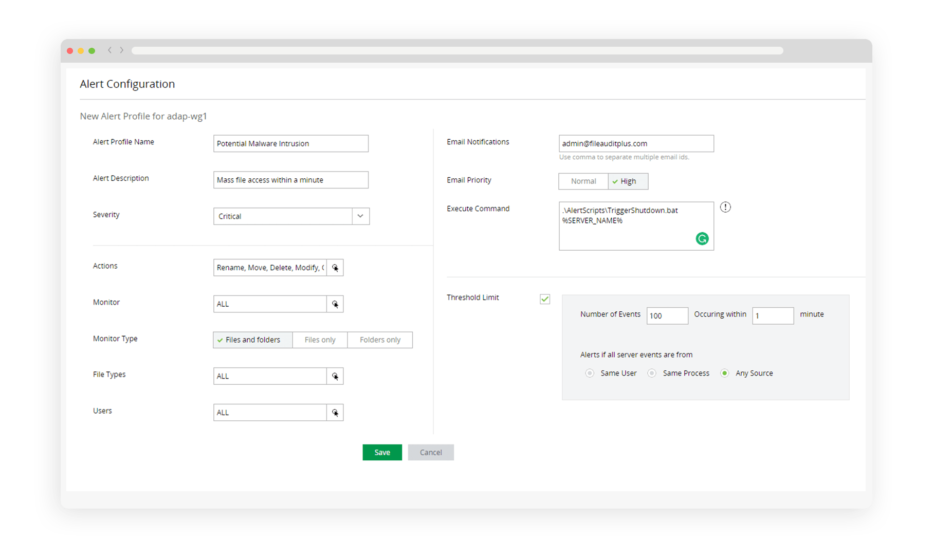 您现在已成功配置DataSecurity Plus,以检测并响应在一分钟内检测到超过100个文件事件(如创建,修改和重命名)的情况。根据组织的需要,您可以使用过滤器选项包括或排除特定文件类型,用户,操作等,以进行更具选择性的监视。