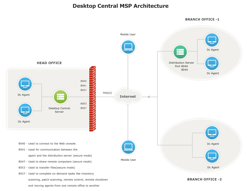 考虑这样一个场景:您的一个客户端处有10台以上的计算机。如果每个代理都联系服务器以下载所需补丁、软件二进制文件等,则会导致一定的带宽负载。在这种情况下,您可选择在客户端位置的一台计算机上安装分发服务器。分发服务器会定期与中央服务器同步补丁和软件二进制文件。安装在客户端计算机中的代理将与分发服务器联系,拉取可用任务,并从分发服务器下载补丁和软件二进制文件。