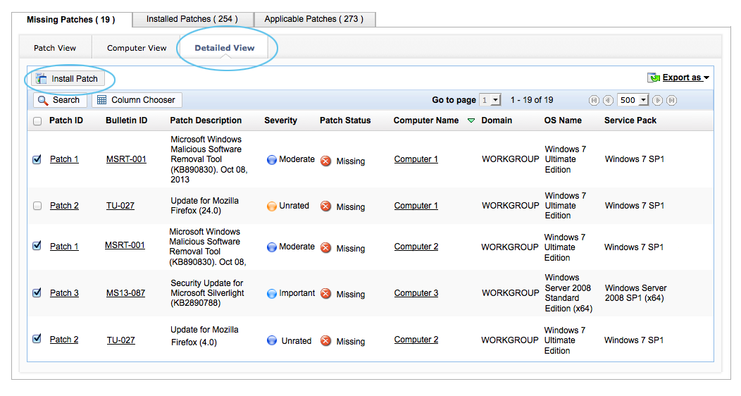 详细视图 下的 所有补丁 创建配置, 以下情况将生效。详细视图会将每个单独计算机缺失的每个补丁单独列出一行,这意味着如果一个补丁缺失于5台计算机,则会列出5行。