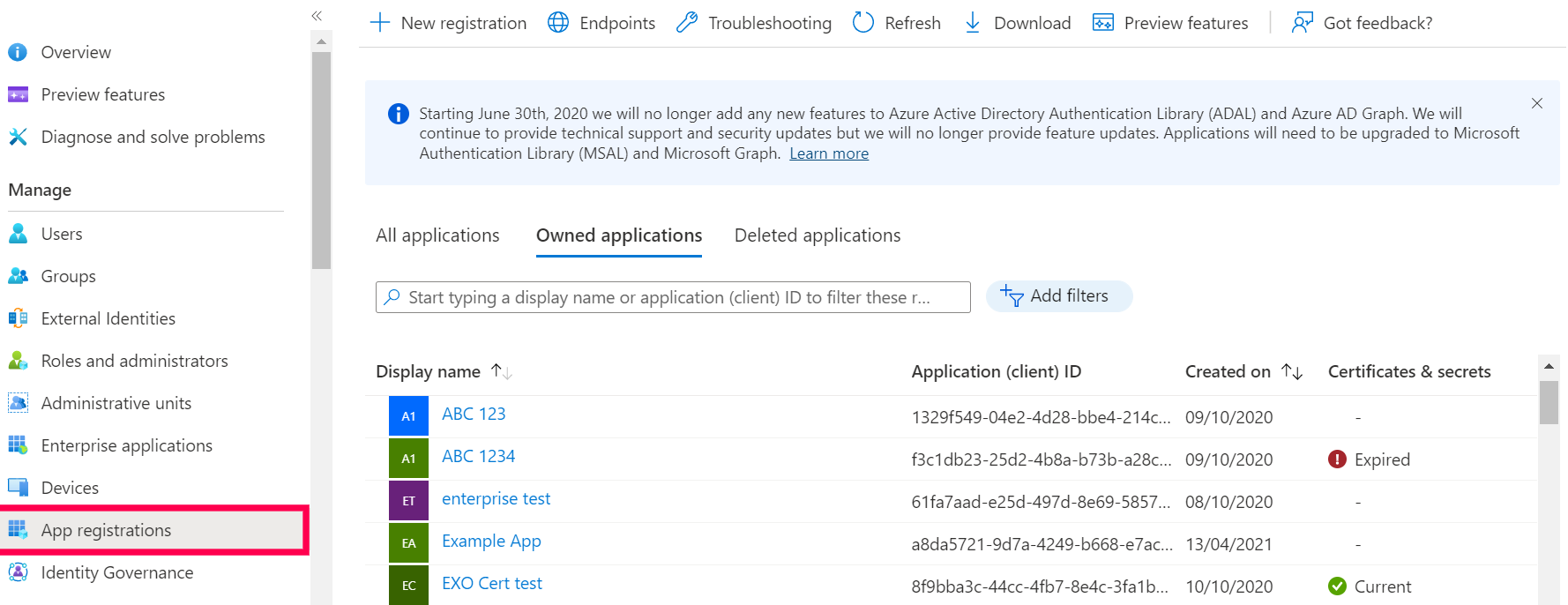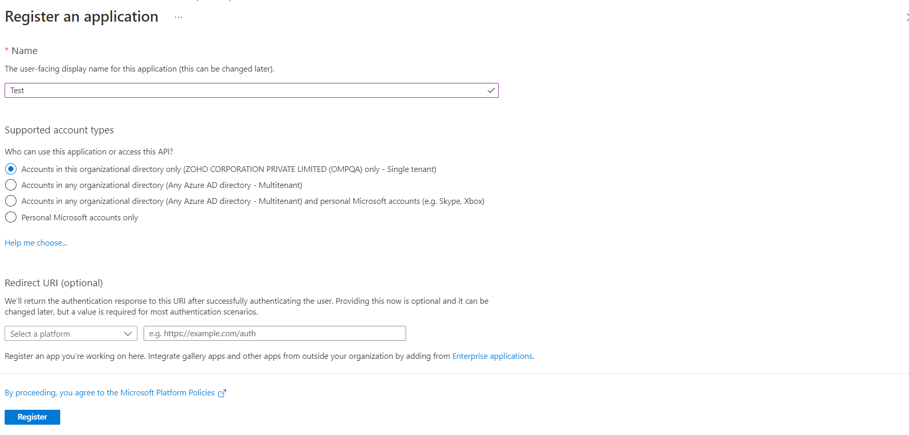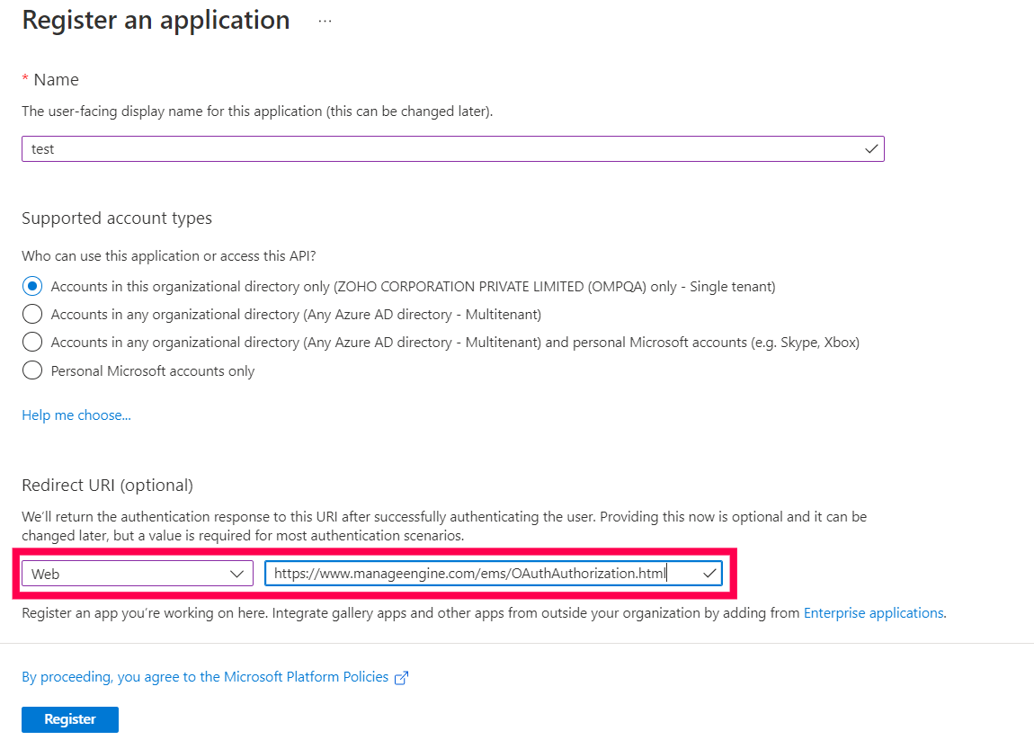 使用您的 Microsoft 凭据登录并导航至 应用注册 并点击 新注册.