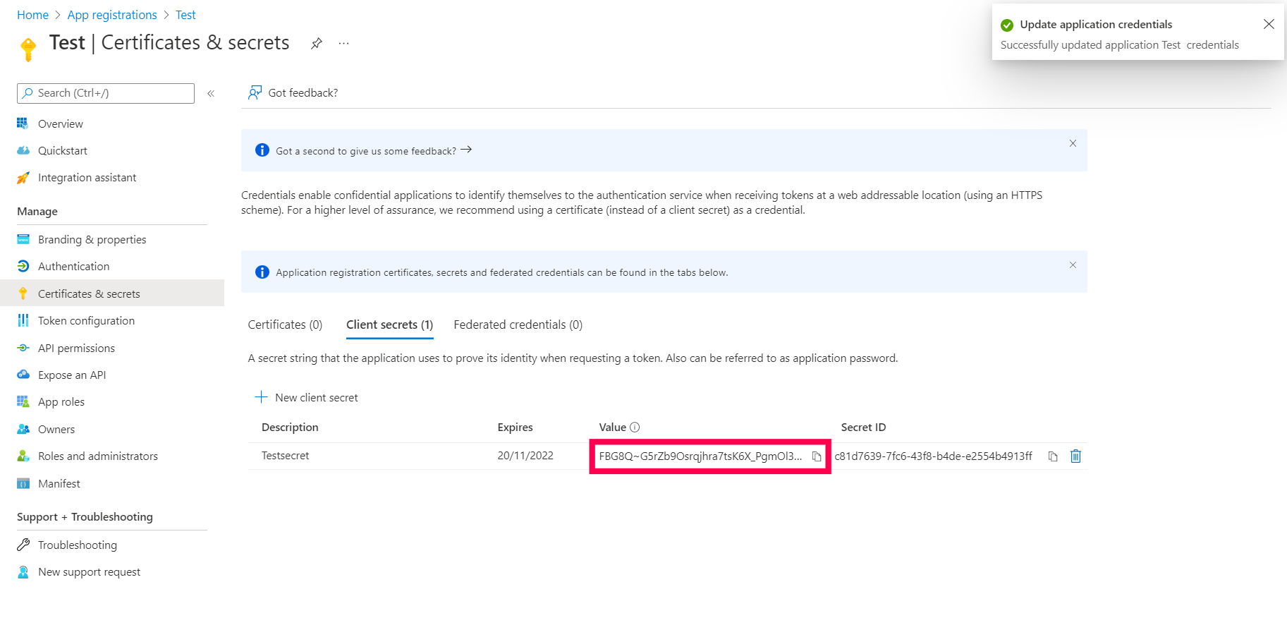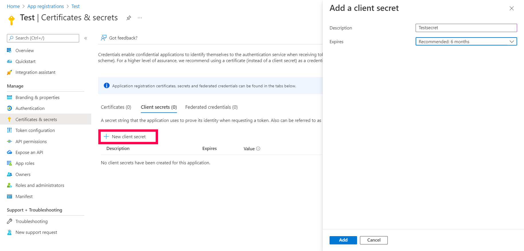输入描述和密钥有效期,然后点击 添加 以获取 客户端密钥.