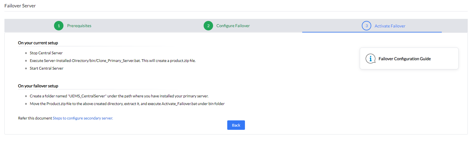 <ServerInstalled_Directory>\UEMS_MSP CentralServer\bin.<ServerInstalled_Directory>\UEMS_MSP CentralServer folder.注意:确保次服务器有权限从主服务器同步数据,反之亦然。