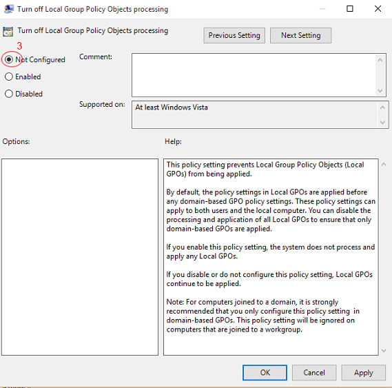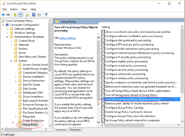 点击“关闭本地组策略对象处理”,如下所示。