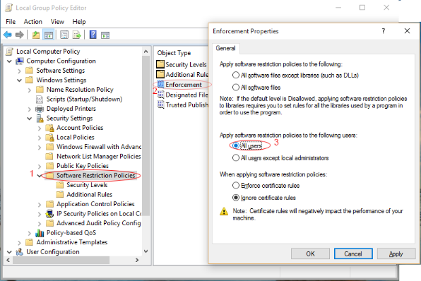 如果您想阻止特定目标的可执行文件,则必须创建策略。选择目标计算机是创建策略的第一步。您需要选择数据库中存在的需阻止的可执行文件。如果是首次阻止某个可执行文件,则需要添加该可执行文件并选择阻止规则为路径或哈希。针对单个可执行文件,您可以创建两条不同策略,一条使用路径规则,另一条使用哈希值。该策略将在系统重启后首次应用于目标计算机。