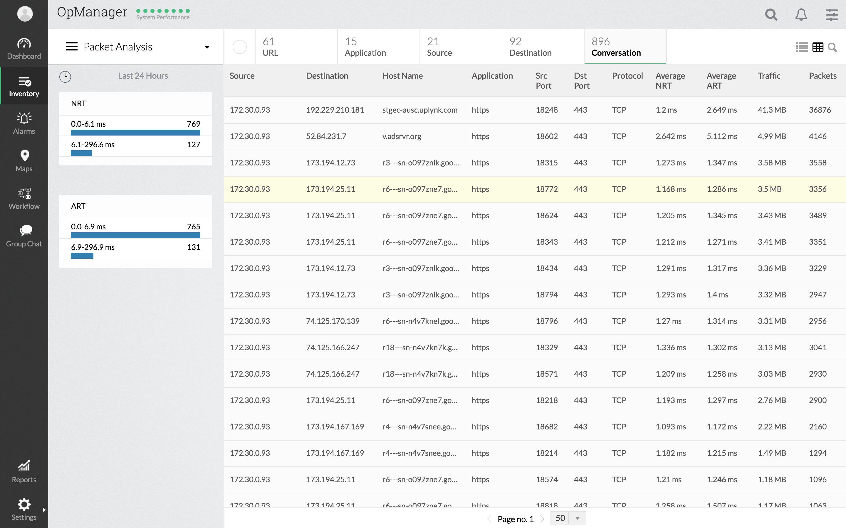 OpManager的DPI功能从网络流中捕获数据包并分析数据包捕获(PCAP)文件。它进行数据包级分析,以查找网络或应用程序是否引起了更多延迟,以便管理员可以迅速发现此类问题并在影响最终用户之前对其进行修复。