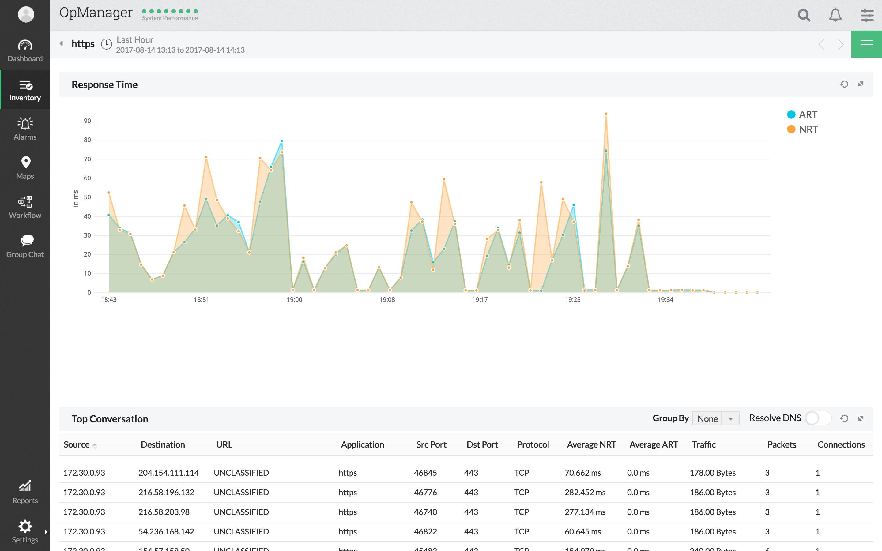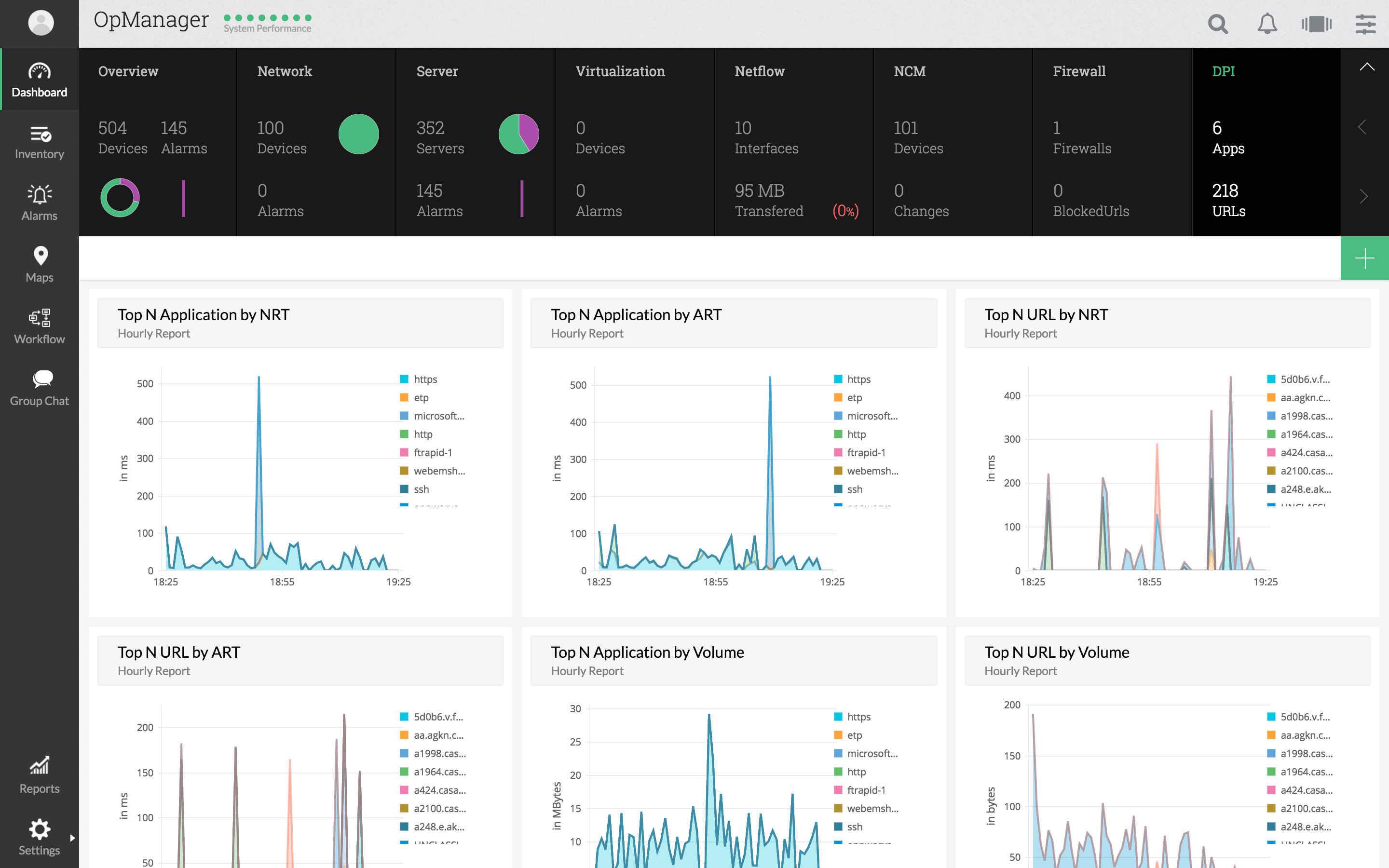 除了SNMP和基于流的带宽监视之外,OpManager还提供基于深度数据包检测(DPI)的带宽监视。DPI的最大的优势是,它在读取数据包时可为您提供最准确的带宽信息。此外,它还通过提供网络响应时间(NRT)和应用程序响应时间(ART)来帮助您找到用户体验问题的根本原因,这有助于网络和应用程序团队确认延迟是由网络问题还是由应用程序问题引起的。