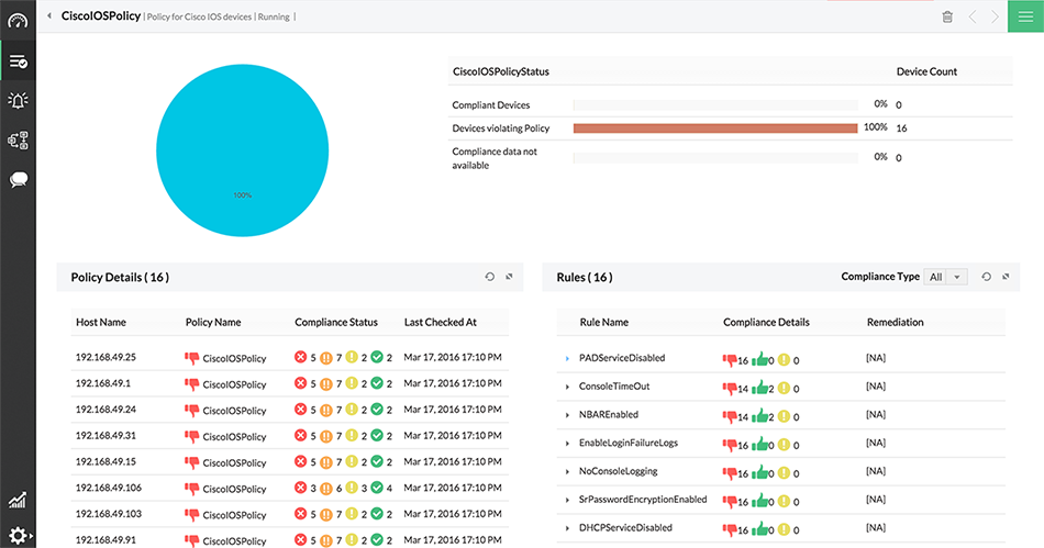 OpManager中的网络配置模块可帮助管理员定义并实施标准,这些标准可以是任何东西-确认是否存在某些字符串、命令或值。OpManager Plus将扫描配置是否符合所定义的规则/策略,报告违规情况,并可生成策略合规和违规的报表。