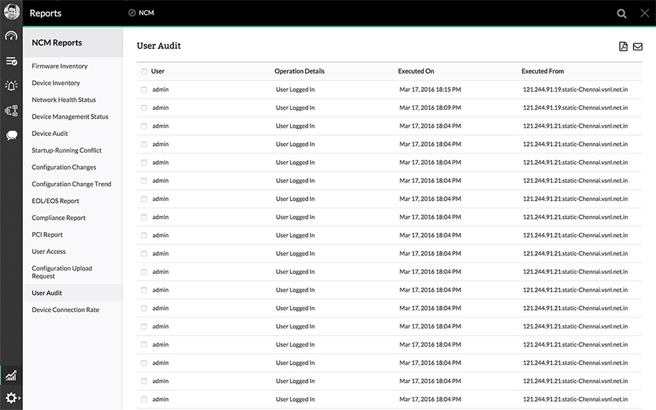 用户执行各种设备配置操作,如备份配置、将配置上传到设备、启用实时更改检测等。当由于错误的配置更改而导致出现问题或安全漏洞时,跟踪用户操作就十分重要了。为了确保这一点,必须记录谁进行了什么操作、在什么设备上、什么时间及操作结果的信息,这就是OpManager Plus的网络配置模块中的“审计”功能所做的工作,被称为“设备操作审计”。