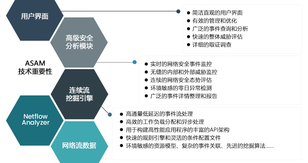 高级安全分析模块是一个基于网络流的安全分析和异常检测工具,它利用最先进的Continuous Stream Mining Engine™检测零日网络入侵并对其进行分类,实时处理网络安全威胁。ASAM提供可操作的信息以检测广泛的外部和内部安全威胁,并对网络安全进行连续的整体评估(网络安全性屏幕截图)。