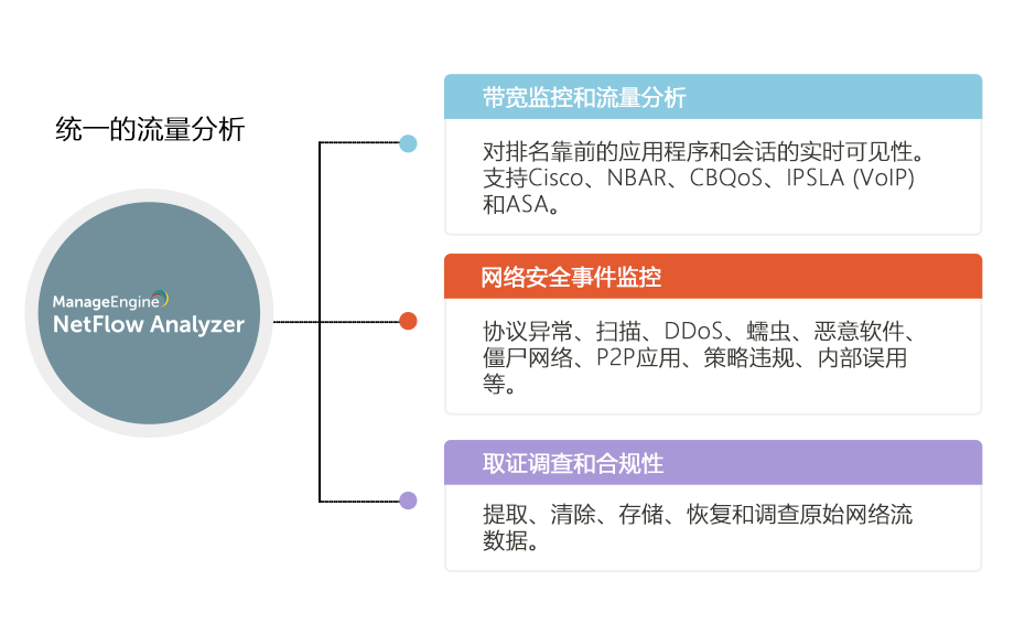 作为NetFlow Analyzer的简单附加模块,ASAM利用底层平台的无代理集中式数据收集和取证分析功能提供更大的价值。NetFlow Analyzer是一个强大、可扩展且可靠的平台,提供带宽监控和统一流量分析。