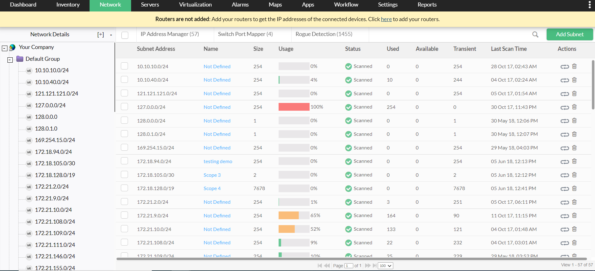 在网络中管理IP地址可能既艰苦又耗时。为了解决这个问题,强大的NOM工具OpManager Plus有助于全天候扫描、监控和高效管理IPv4和IPv6地址和子网。这个综合工具提供了可用IP地址的列表,并在出现任何IP冲突时提醒管理员。OpManager Plus跟踪交换机端口和连接到它们的设备,同时帮助管理员进行容量规划,以便优化使用交换机端口。