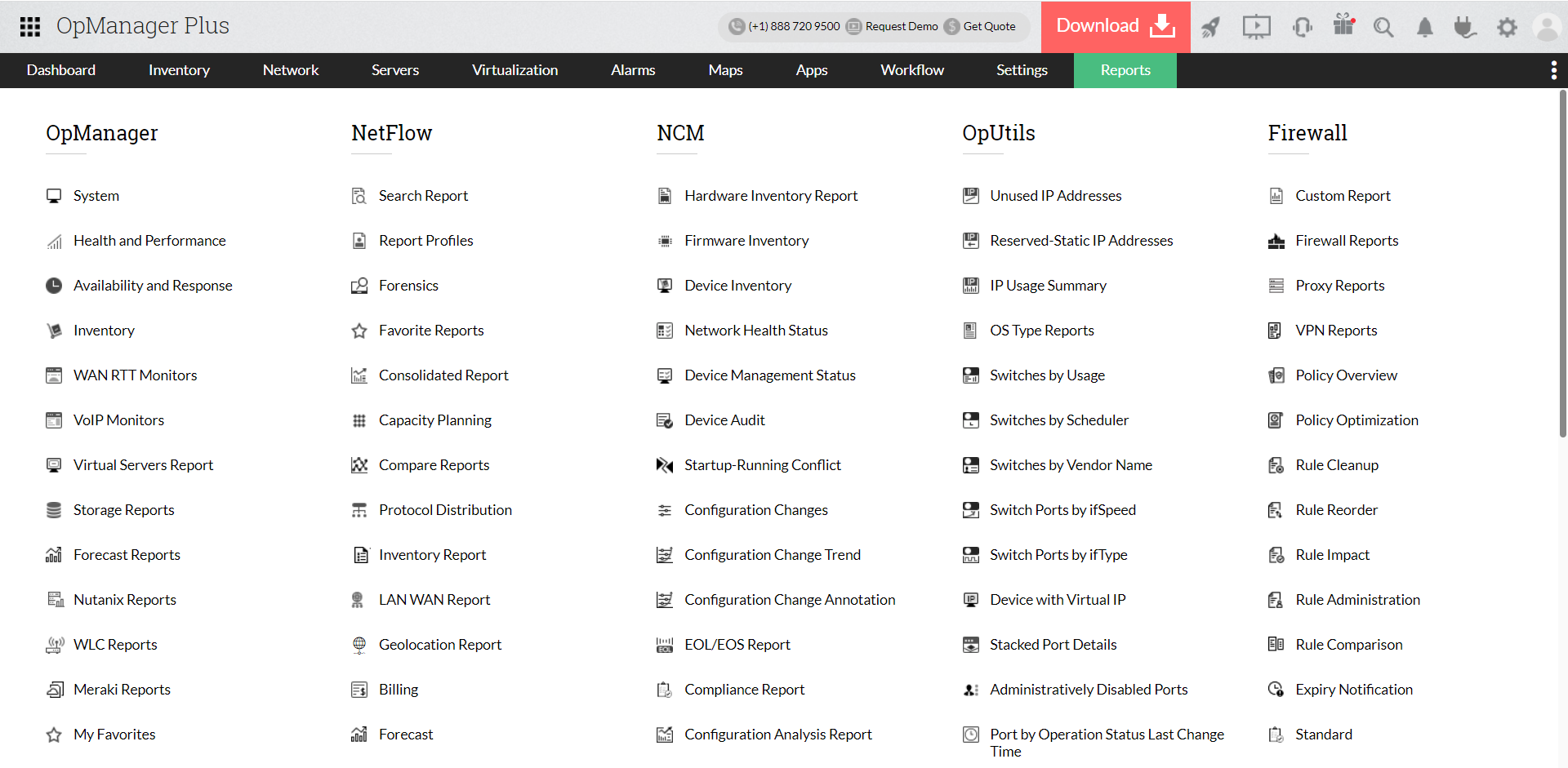 使用高效的网络运营管理工具OpManager Plus,管理员可以监控网络运营并轻松观察模式。他们可以检查设备和接口的可用性,并实时跟踪性能统计数据。报表可以定制,技术人员可以根据需要自动生成报表。OpManager Plus的报表,因为它有助于管理员预测网络运营的困难,并提前补救它们。