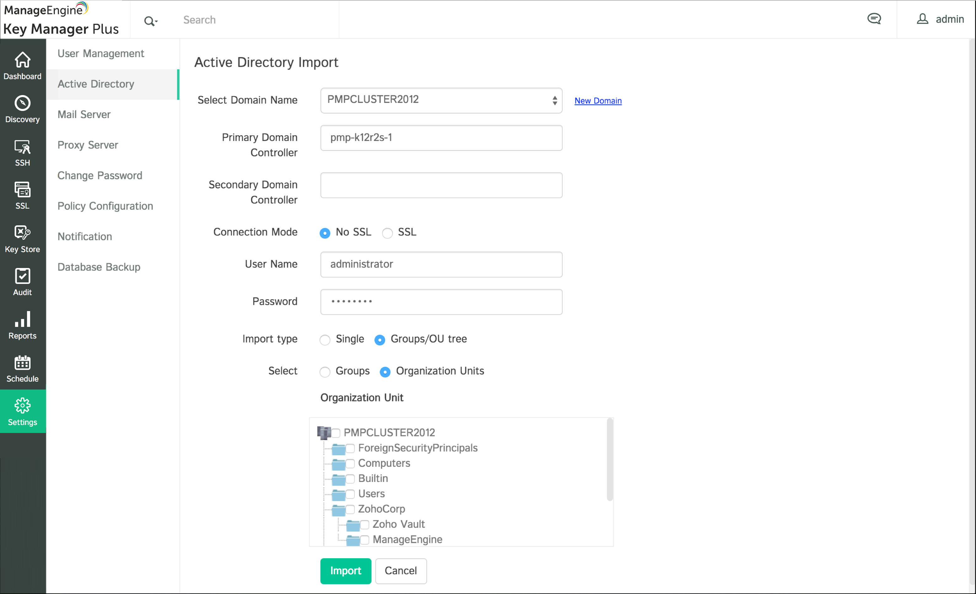 Key Manager Plus 的 AD 集成功能允许快速导入用户。数据库持续与目录同步,系统在 AD 中添加或删除用户时,数据库会自动更新。此外,Active Directory 的身份验证功能可扩展至 Key Manager Plus,以便用户使用他们的 AD 凭证登录。
