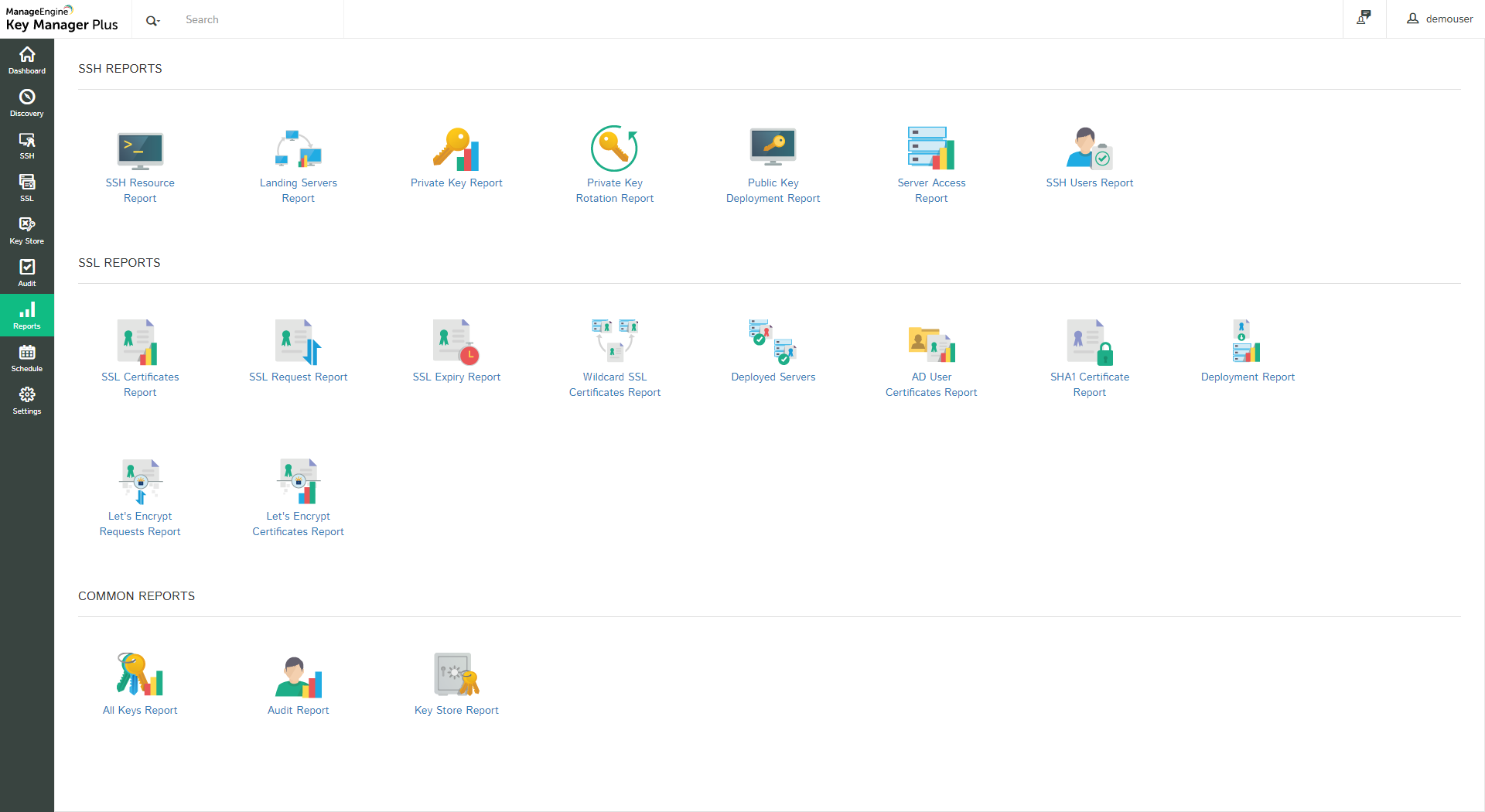 此外,您还可使用 Key Manager Plus 报告所有密钥、审计以及 SSH 密钥和 SSH 证书管理的常用密钥库。