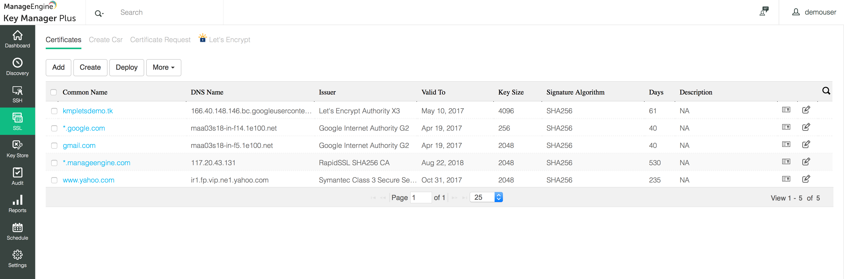 Key Manager Plus 通过提供安全的集中存储库来帮助管理 SSL 证书的整个生命周期。您可以查看证书的所有相关详细信息,跟踪其历史记录,甚至可以导入或导出证书文件。所有这些操作都经过审核,并且可跟踪至相应用户,从而帮助管理员保持对 SSL 环境的完全控制,避免在网络中使用易受攻击的证书。
