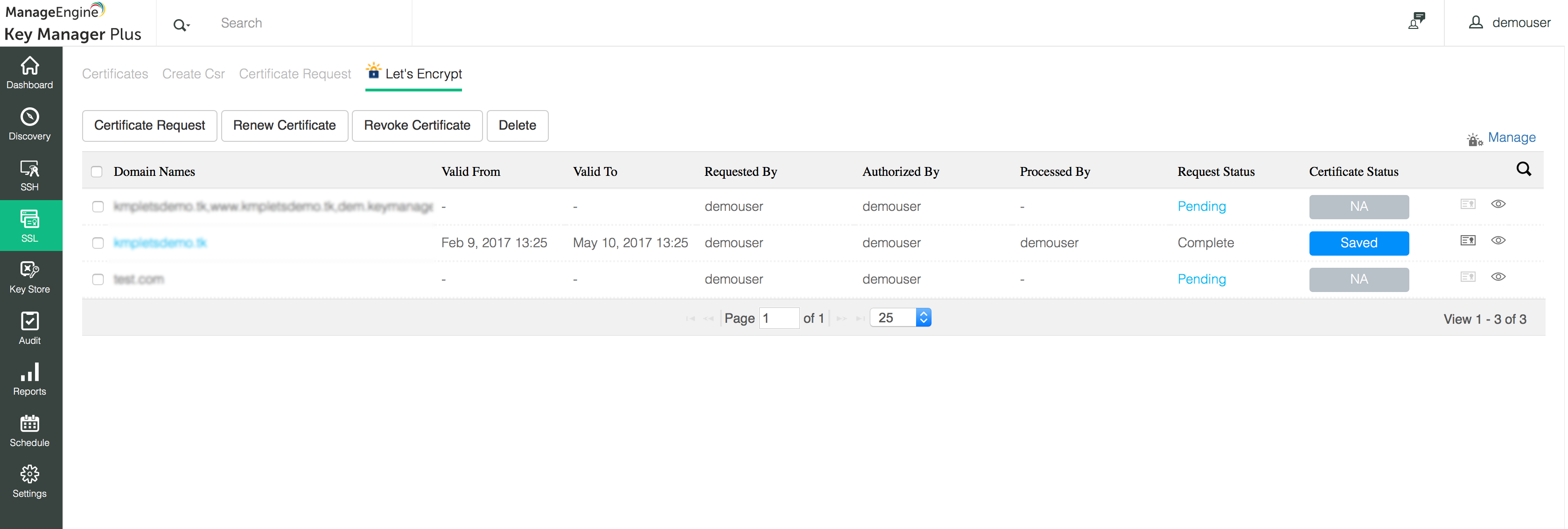 收到请求时,Let's Encrypt 会发出一组问题来验证您对该域的所有权。Key Manager Plus 通过回答这些问题来自动完成域验证。进行域验证后,Let's Encrypt 会发放证书,此证书将添加至 Key Manager Plus 的证书存储库。