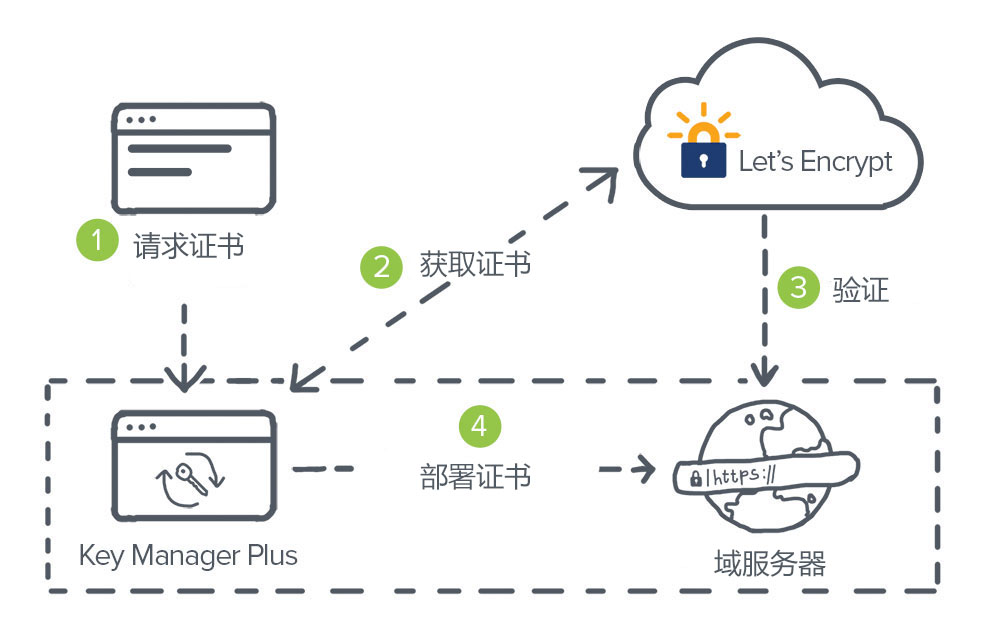 Key Manager Plus 通过与 Let's Encrypt(开放式认证中心)集成来确保全面管理公共网站的证书生命周期。通常会在创建公用/专用密钥对后向 Let's Encrypt 发出证书请求。处理验证问题后,系统直接通过产品界面将所获得的证书将部署至相应域服务器。Key Manager Plus 会整合证书并在证书到期时及时续订。
