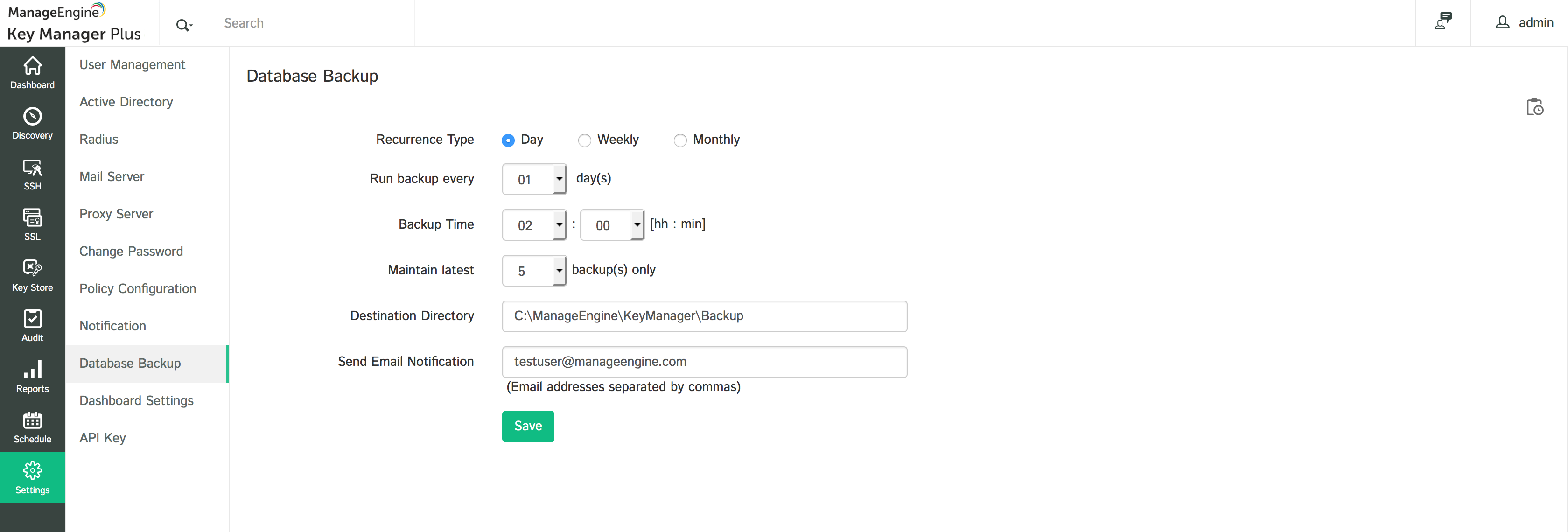生产环境中的主动性对于轻松应对不可预见的情况是不可或缺的。Key Manager Plus 允许管理员定期备份整个数据库,以便用于灾难恢复。