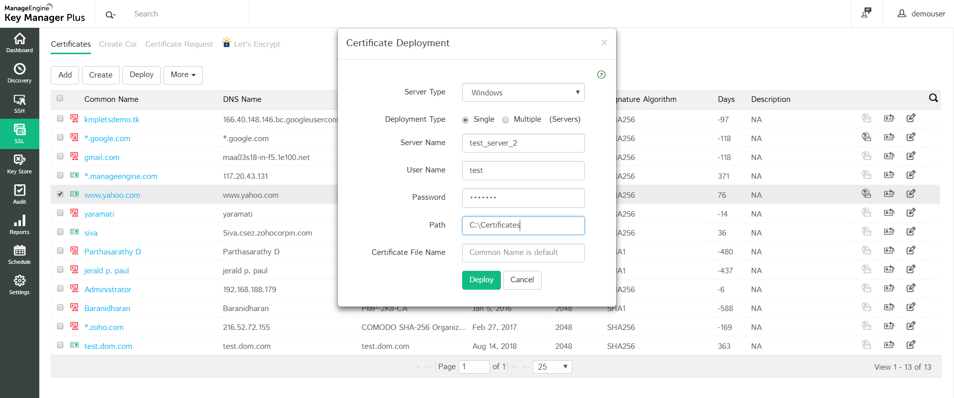 使用 Key Manager Plus 可自动执行此过程以快速将证书部署到相应的域服务器。要将存储库中存储的证书部署到其相应域服务器,您只需提供基本细节,例如,服务器名称、用户名、密码、端口号以及证书在服务器上的目标路径。一旦您指定了服务器详细信息,Key Manager Plus 就会将证书部署到指定的位置,并且可以方便地部署到其他服务器上,这些操作都是通过单一界面完成的。