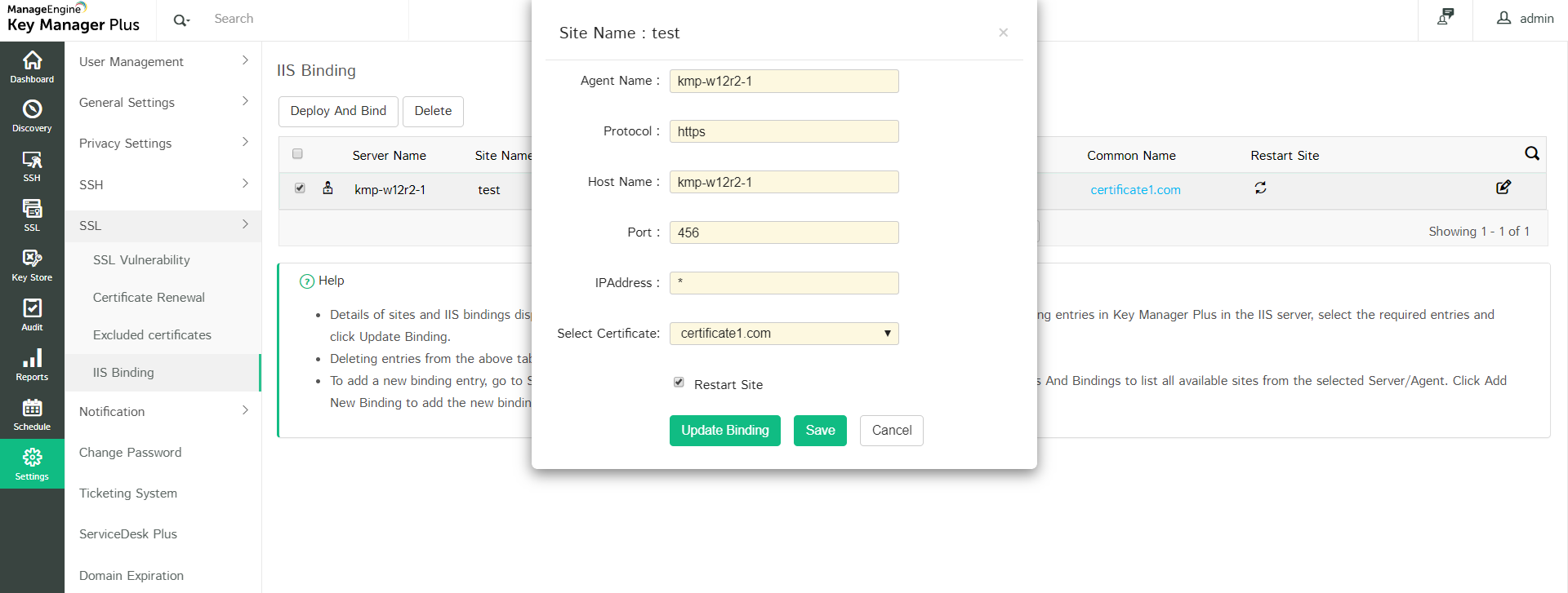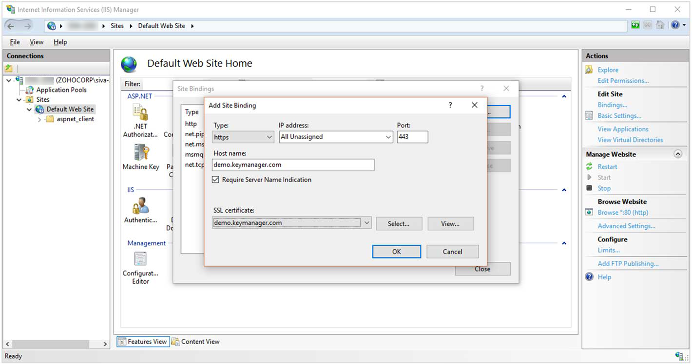 Note: IIS Binding for the Deployment Type Single will work only if the IIS server and Key Manager Plus are in the same domain, which has .Net Framework version 4 or above enabled. However, if an IIS Server resides in a demilitarized zone, choose the Deployment Type as Agent and proceed with the steps for the same given below.