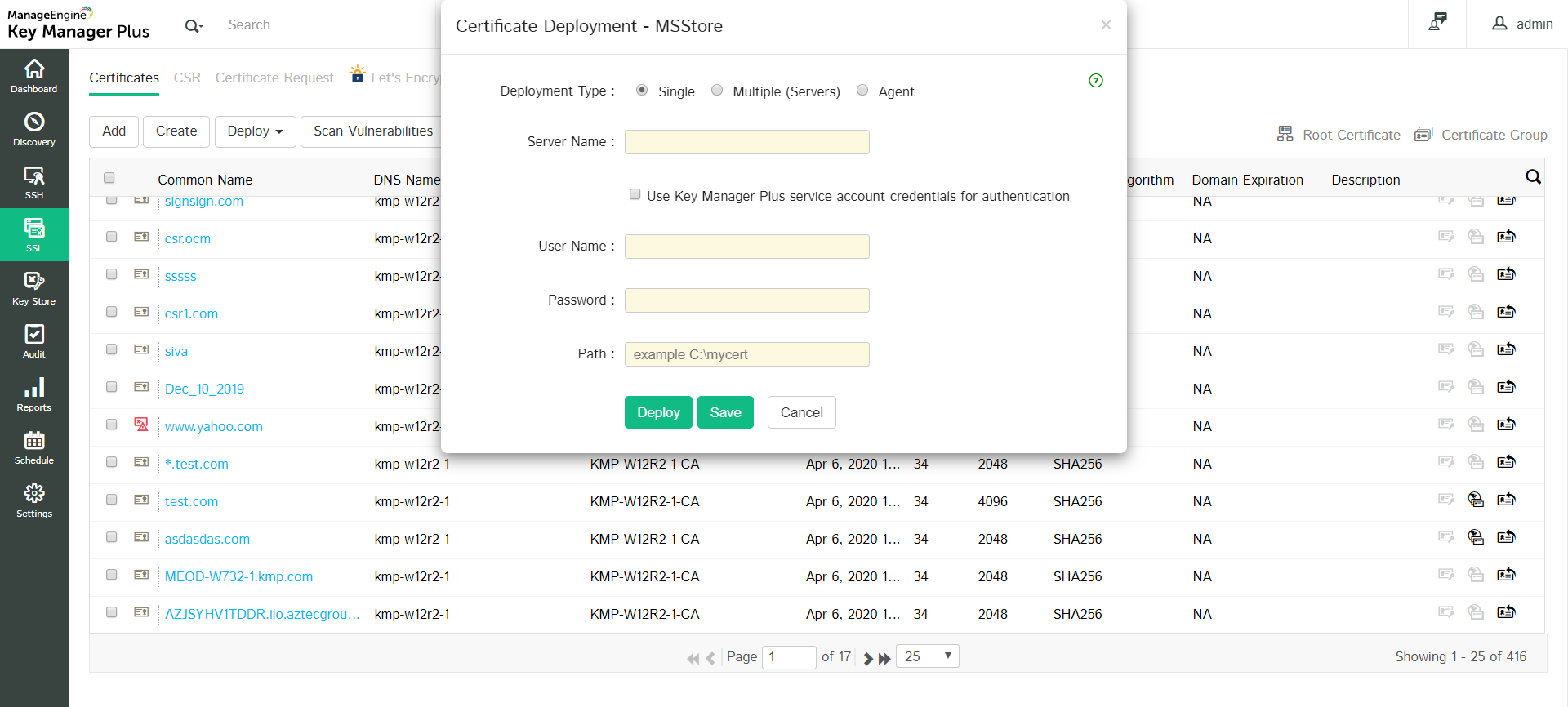 For file-based deployment, if the Certificate and Keystore file names are not provided, or if multiple certificates are selected for deployment, the Common Name will be used as the file name.1. To deploy certificates on the MS Certificate store, choose the server type as Microsoft Certificate Store.