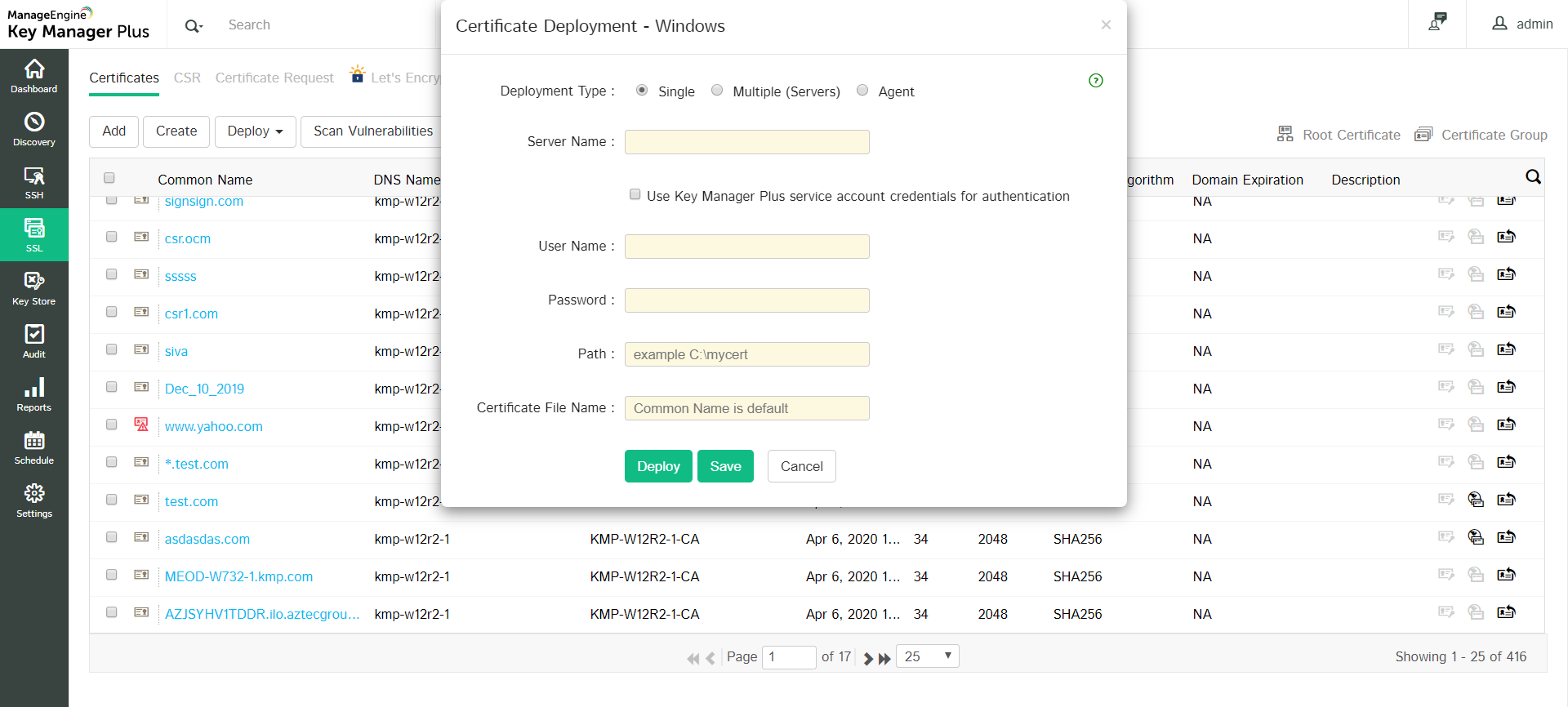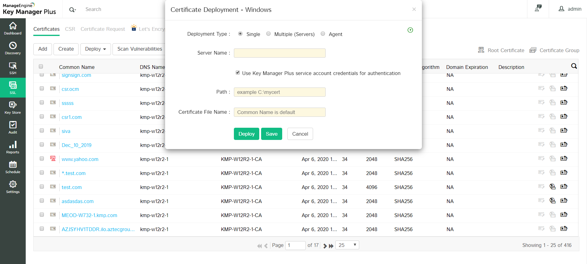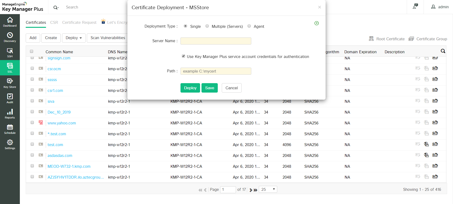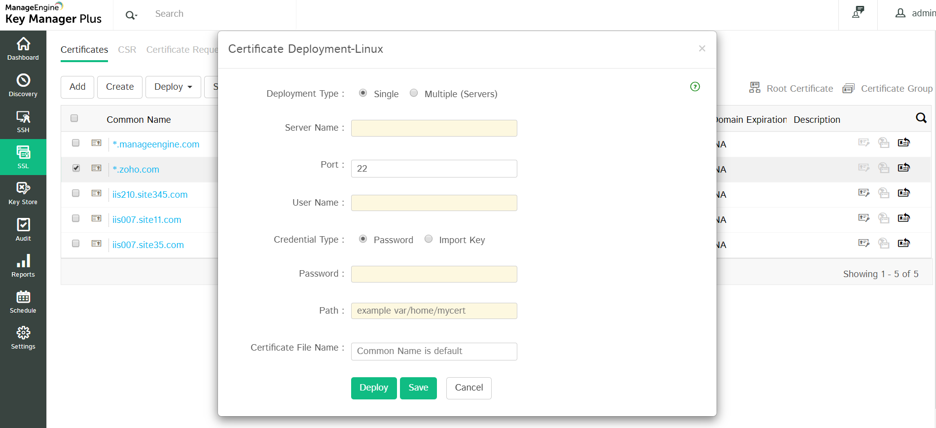 After providing the details, click Deploy. The certificate is deployed on the specified server/agent in the specified path.