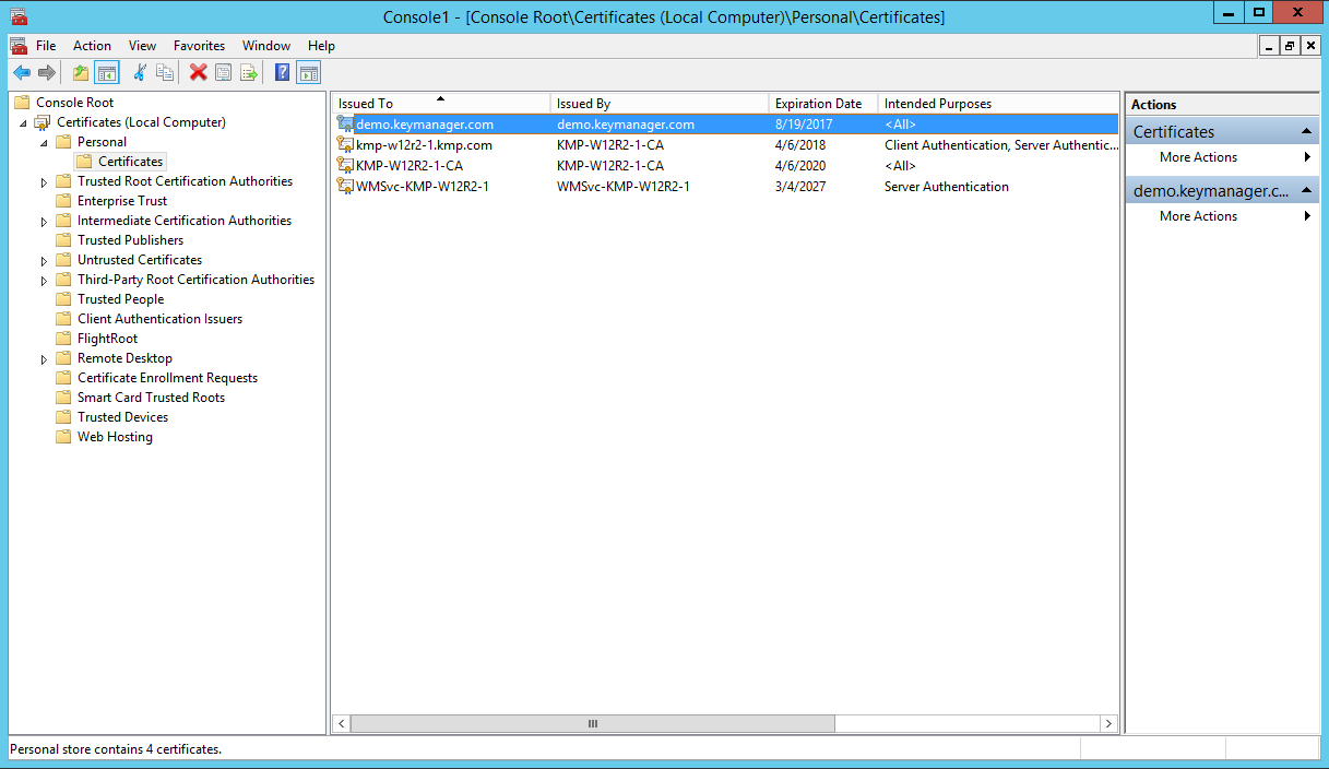 3. If you choose the Deployment Type as Agent, choose the host name of the KMP agent from the Select Agent drop-down and click Save to save the agent details. After providing the details, click Deploy. The selected certificates are deployed in Personal Certificates.