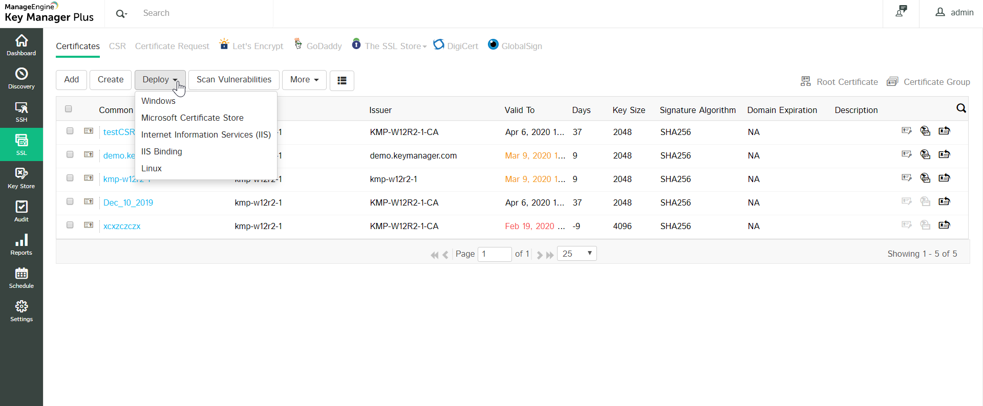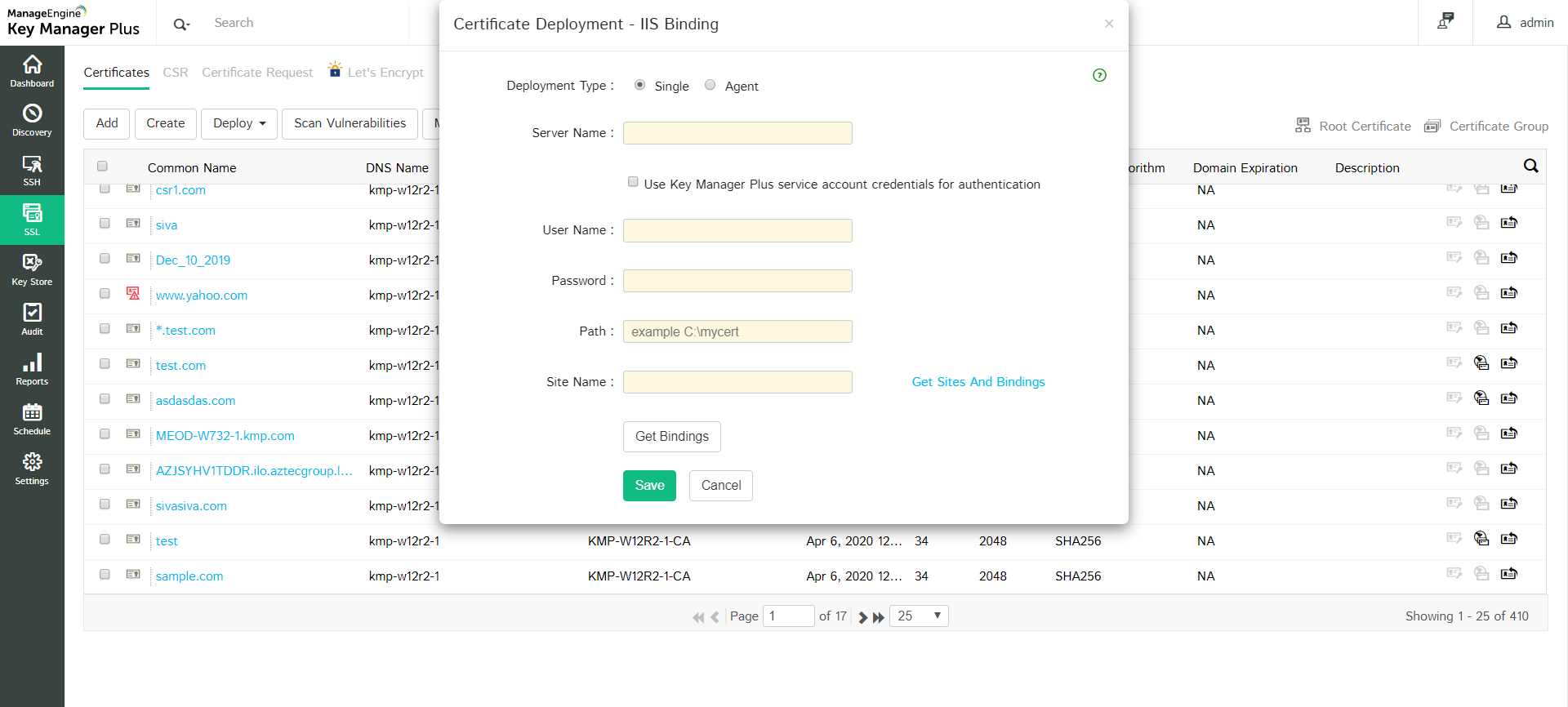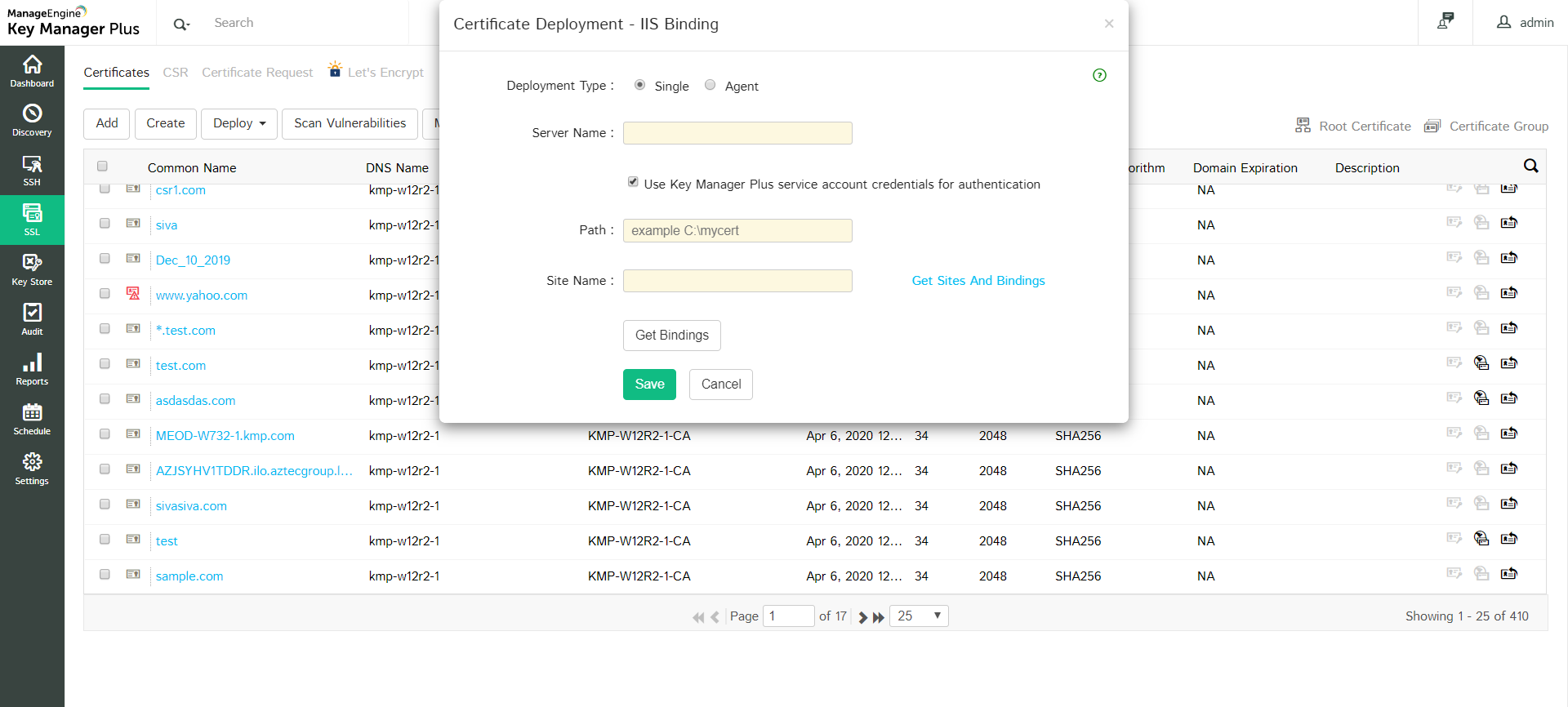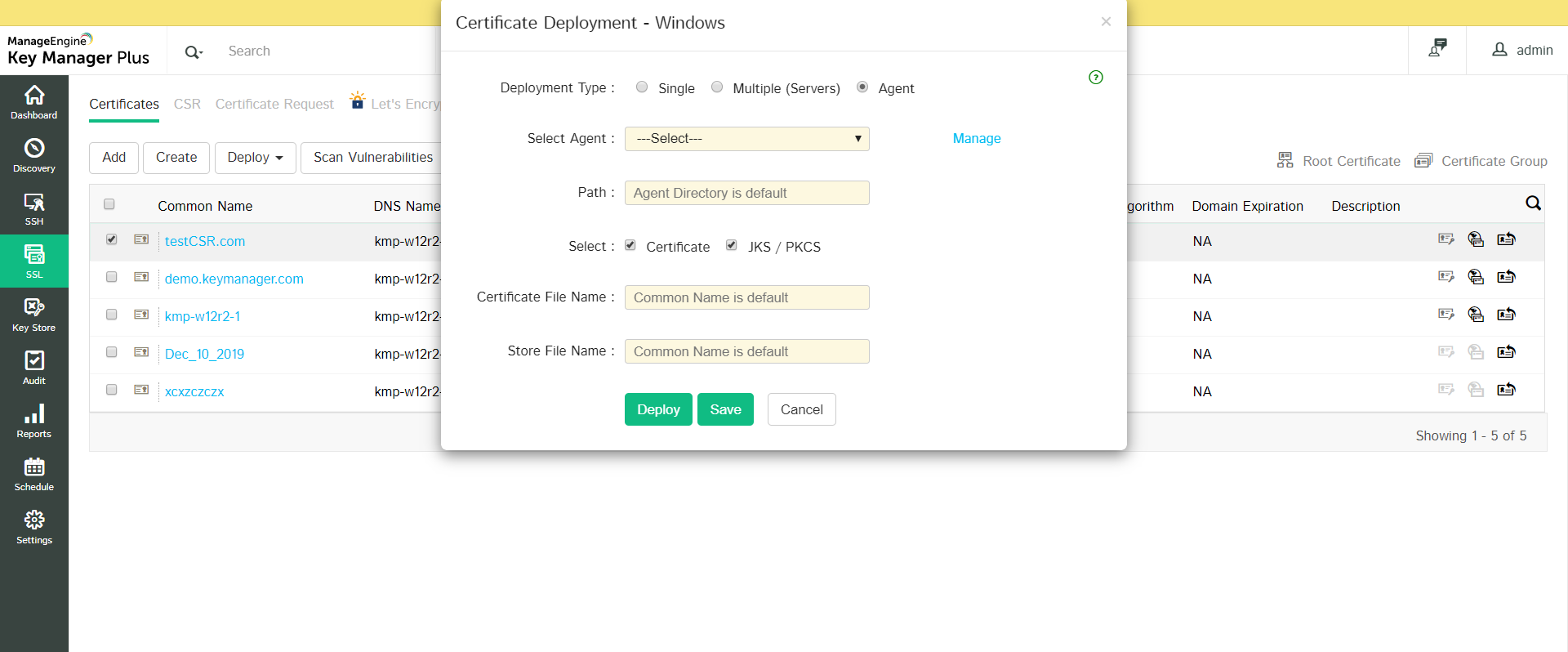 In general, SSL certificates procured from Certificate Authorities (CAs) are stored in a repository and then manually deployed on appropriate target systems. Key Manager Plus deploys the certificates from the repository on the correct target systems automatically. You can use Key Manager Plus to deploy the certificates on the various systems individually, or in bulk, based on your requirements. Also, you can use the Key Manager Plus agent to deploy certificates on servers that reside in demilitarized zones outside of the domain where the Key Manager Plus server is present.