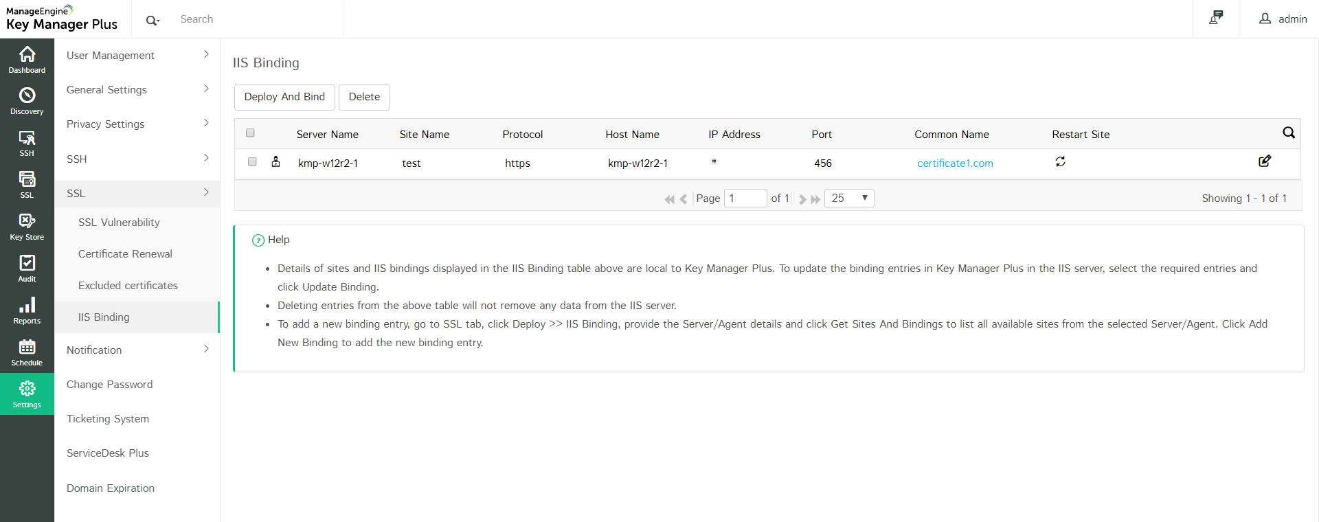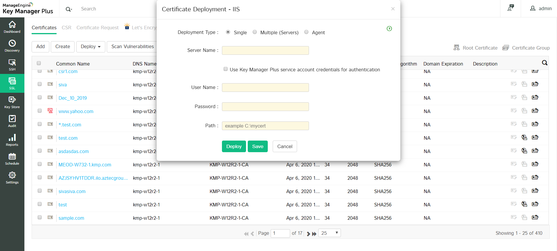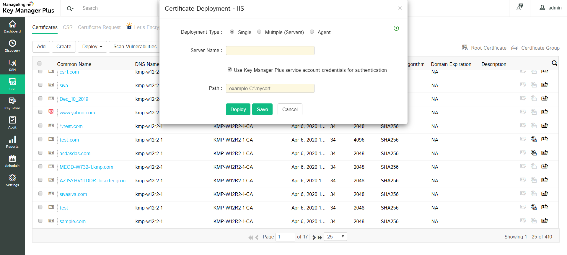 4. Click Deploy. Now, the selected certificate will be deployed to the specified IIS server.