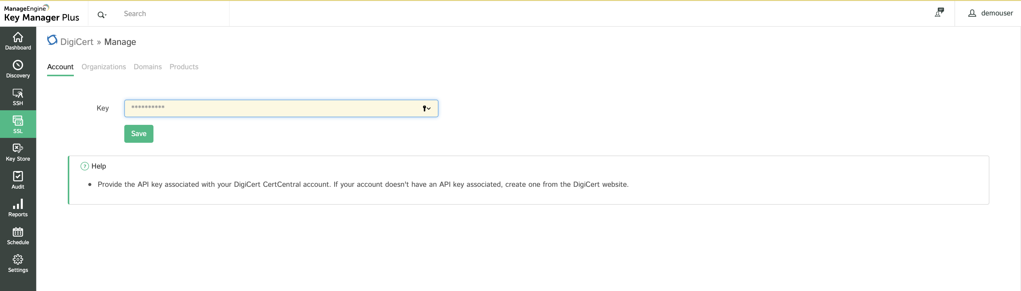 If you have an account with DigiCert CertCentral already, all you have to do is generate your API key from the CertCentral portal and provide it in Key Manager Plus.