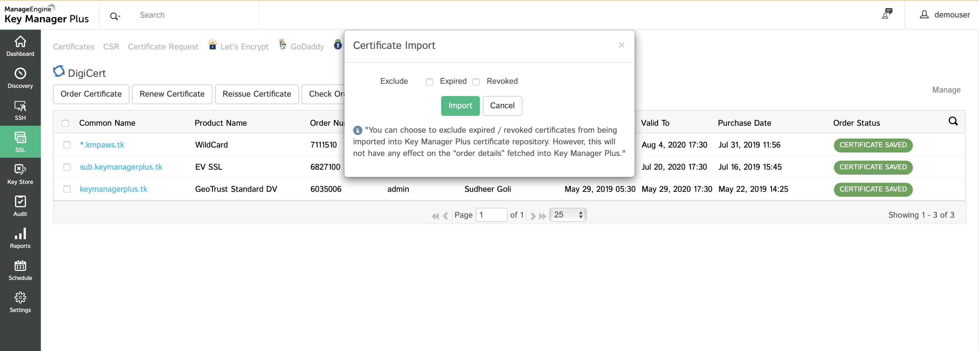 - All the existing certificate orders associated with your CertCentral account are imported into Key Manager Plus.