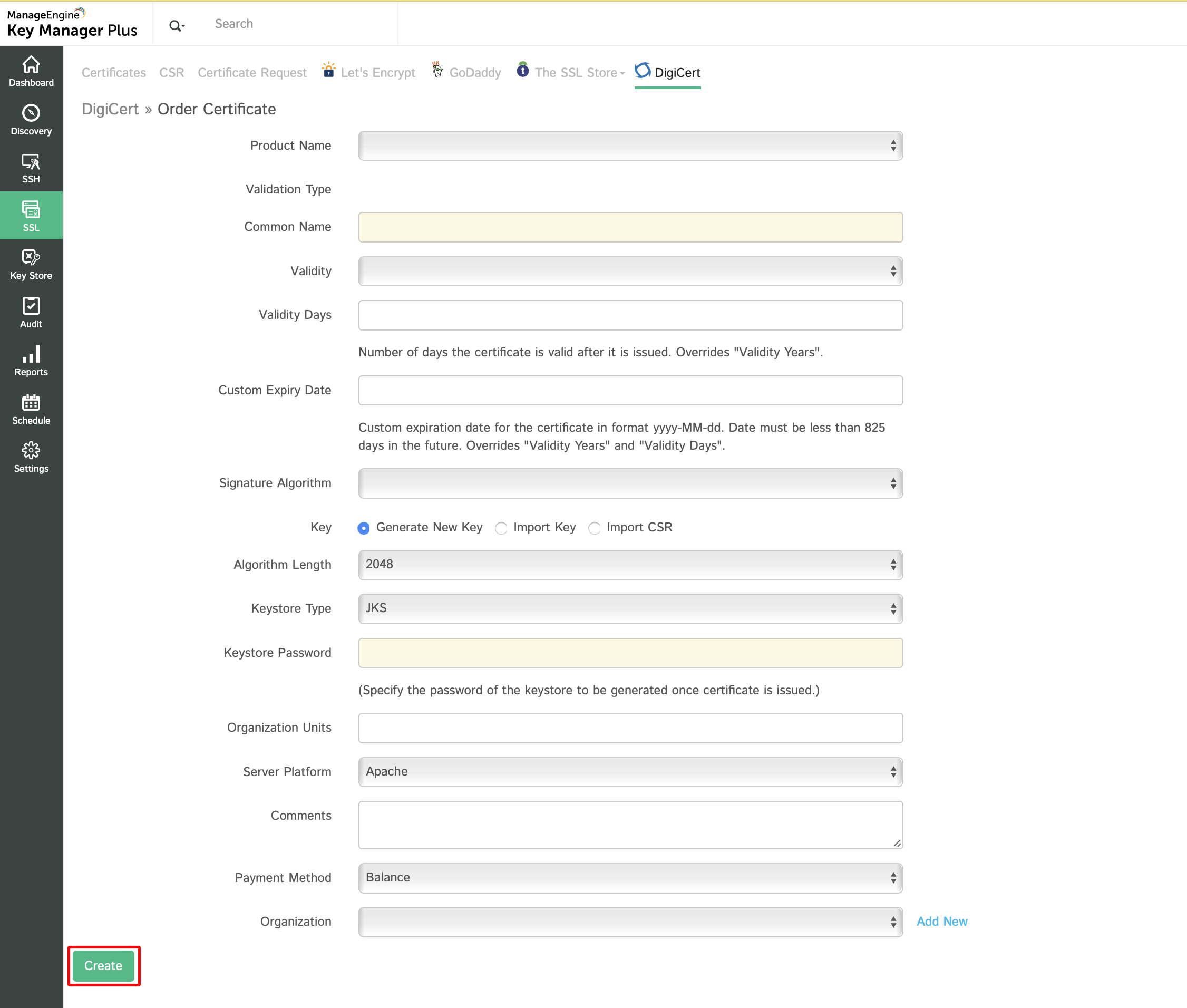 - Navigate to SSL >> DigiCert tab in Key Manager Plus.
