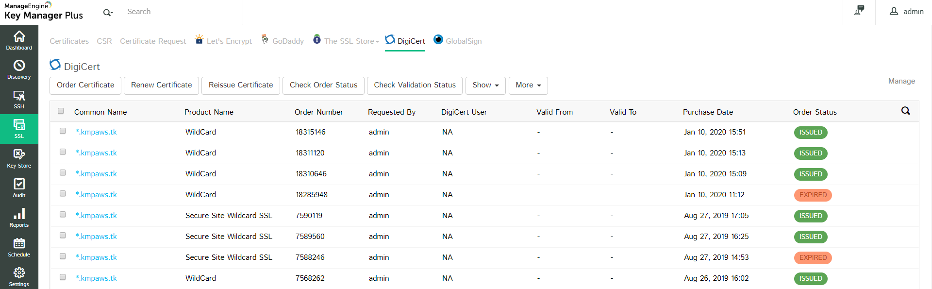 You can renew, reissue, revoke, delete or request reissue for certificates or cancel certificate orders from Key Manager Plus.