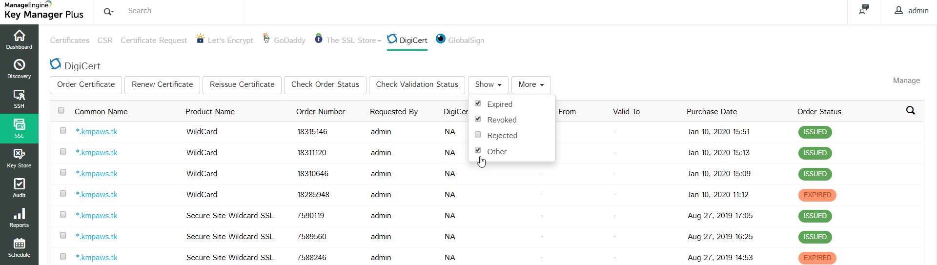 - To filter your order view according to the order status, click the Show drop-down from the top menu and select from the options Expired, Revoked, or Rejected to customize your repository display. For other statuses such as Issued or Pending, select the Other option.