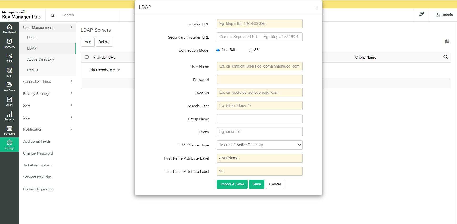 - Import - Click this icon to sync Key Manager Plus with the LDAP server and keep the user database updated. Check the Delete users if deleted in LDAP option to remove deleted LDAP users from Key Manager Plus during the sync operation.